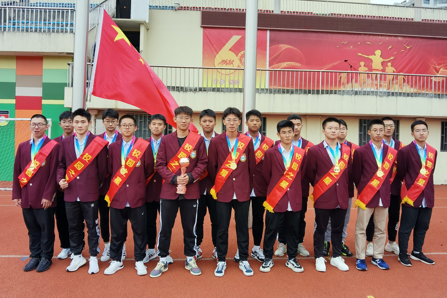 今天的旗手是海安中学足球队的健儿们。江苏省海安高级中学足球队成立于2014年,起初是学生在体育课堂中自发组成,各班级、年级在校园内利用体育课组织比赛。2015年起,教育部发出倡议,倡导举办校园足球联赛,鼓励并培养学生参加足球运动,我校组队开启了训练和足球竞赛之路。