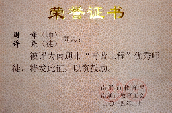 我校周峰、许尧老师被评为南通市“青蓝工程”优秀师徒