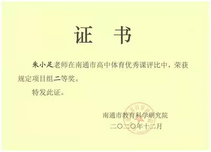 近日,我校卢从生、朱小足两位老师收到了2020年南通市高中体育优课比赛的获奖证书两位老师分别获得南通市一等奖和二等奖。