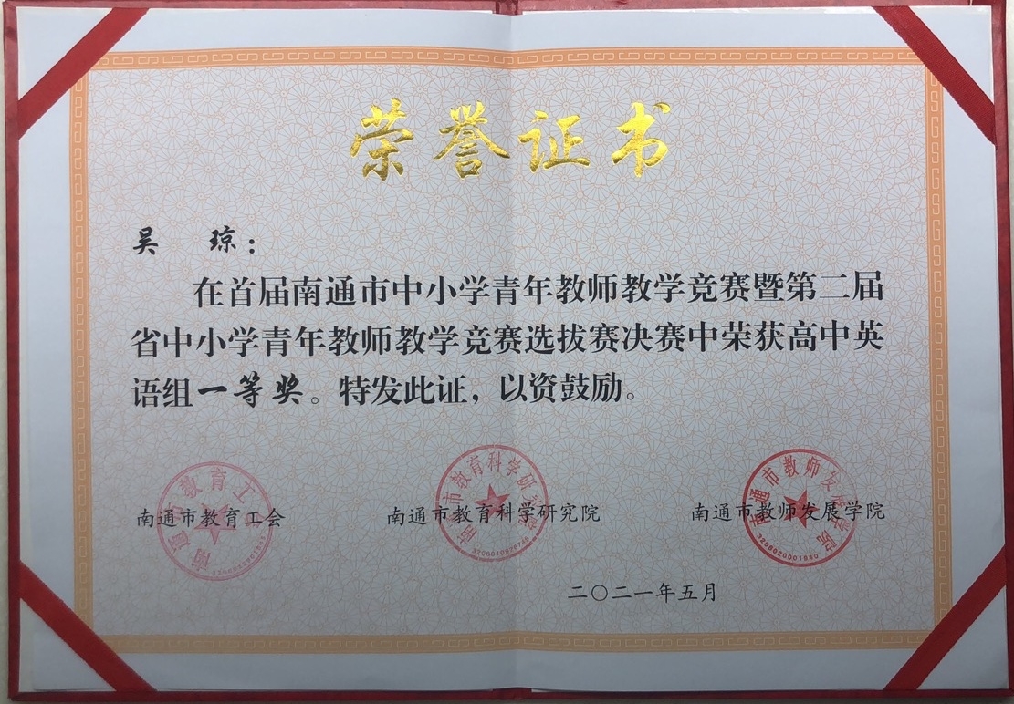 我校吴琼老师参加首届南通市中小学青年教师教学竞赛获奖 来源:英语教研组 发布时间:2021-05-26 00:00:00 浏览次数: 次 【字体:小 大】 2021年5月,我校英语组吴琼老师在由南通市教育工会、南通市教育科学研究院和南通市教师发展学院主办的首届南通市中小学青年教师教学竞赛暨第二届中小学生青年教师教学竞赛评比中,荣获高中英语组一等奖。 分享到: 【打印正文】