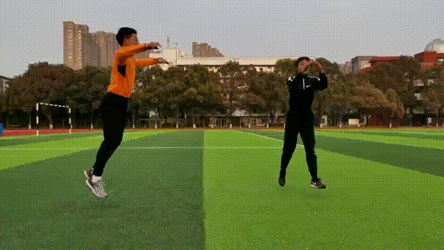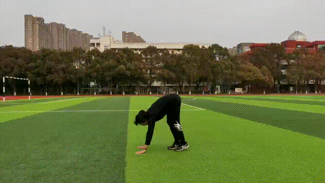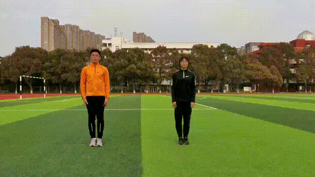 3.跳回地面的时候,先从脚尖落地,膝盖可以微弯,减少冲击力。双脚和双手回到原位。