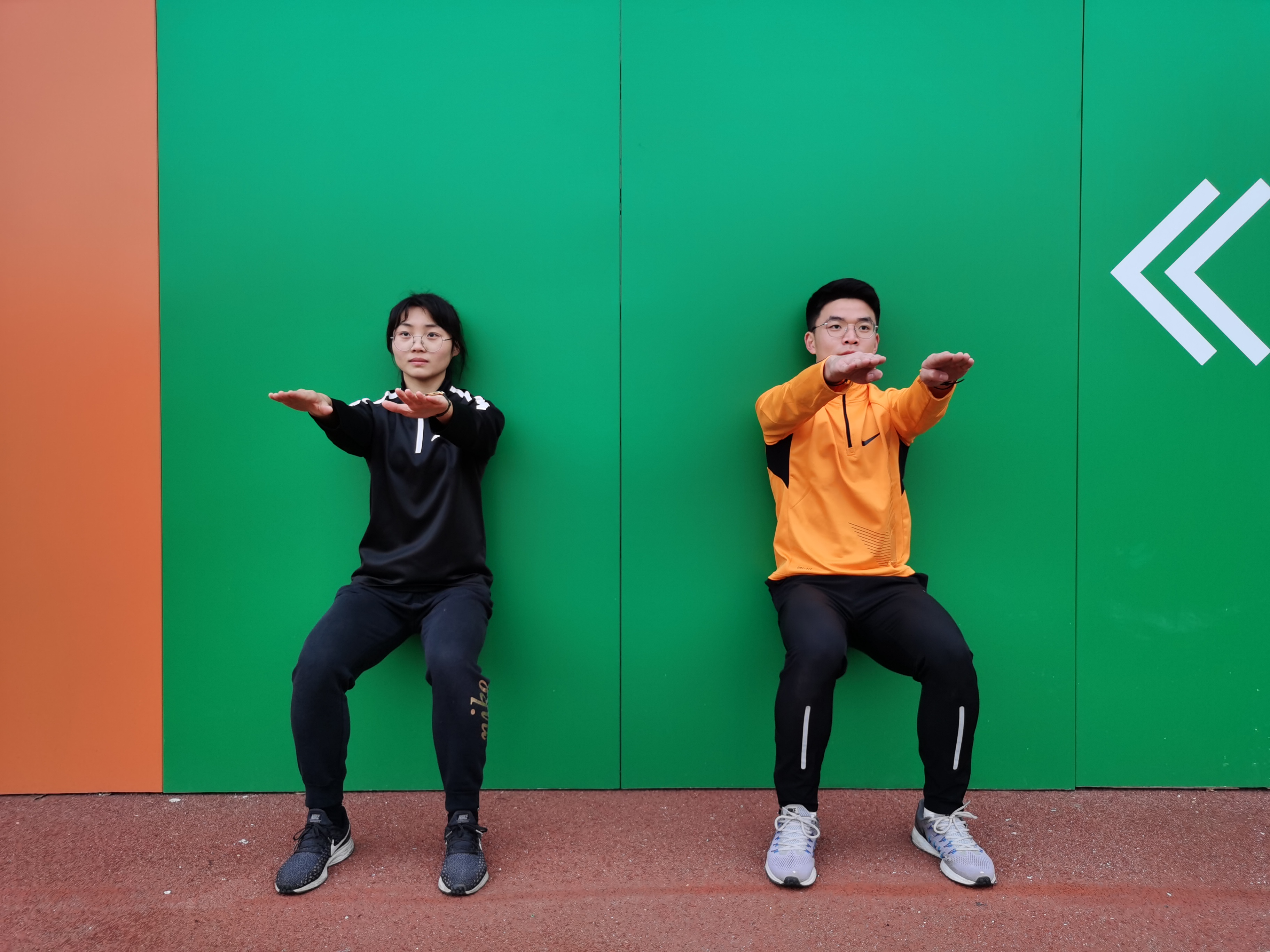 1.背靠墙,双足分开,与肩同宽,逐渐向前伸,双臂前平举,身体下蹲,小腿与地面垂直,大、小腿夹角不小于90度。