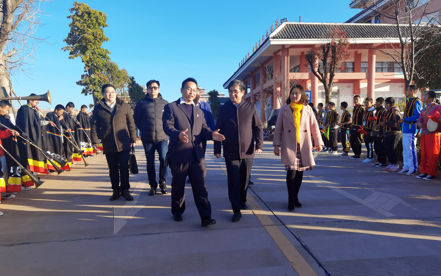 1月5日,交流组一行在双柏县教育体育局副局长郭伟,双柏一中校长尹琼陪同下前往双柏县妥甸中学、爱尼山中心学校和法脿镇雨龙学校调研。妥甸中学的学生们身着彝族特色服饰表演了具有地方特色的过山号、花鼓和小豹子笙,热情欢迎交流团的到访。在妥甸中学段校长的带领下,交流团参观了学校德育处、报告厅、图书室及学生宿舍。段校长详细介绍了学校进行精细化管理和开展劳动教育的相关做法。在爱尼山中心学校,杨斌一行详细了解了该校教师和学生的日常生活情况,并参观了学生食堂、小学各年级教室和新建成的运动场。在法脿镇雨龙小学,调研组在学校领导老师的陪同下参观了校园,了解学校的历史沿革和发展情况。随后,调研组还和法脿镇相关负责同志、各层级学校负责人进行了交流座谈。