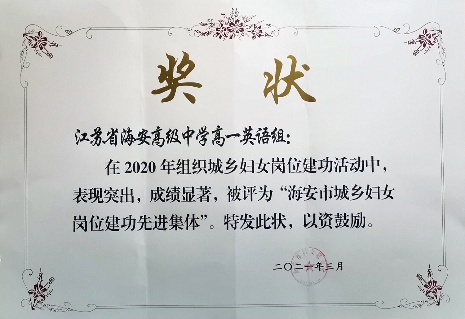 我校高一英语组被评为“海安市城乡妇女岗位建功先进集体”