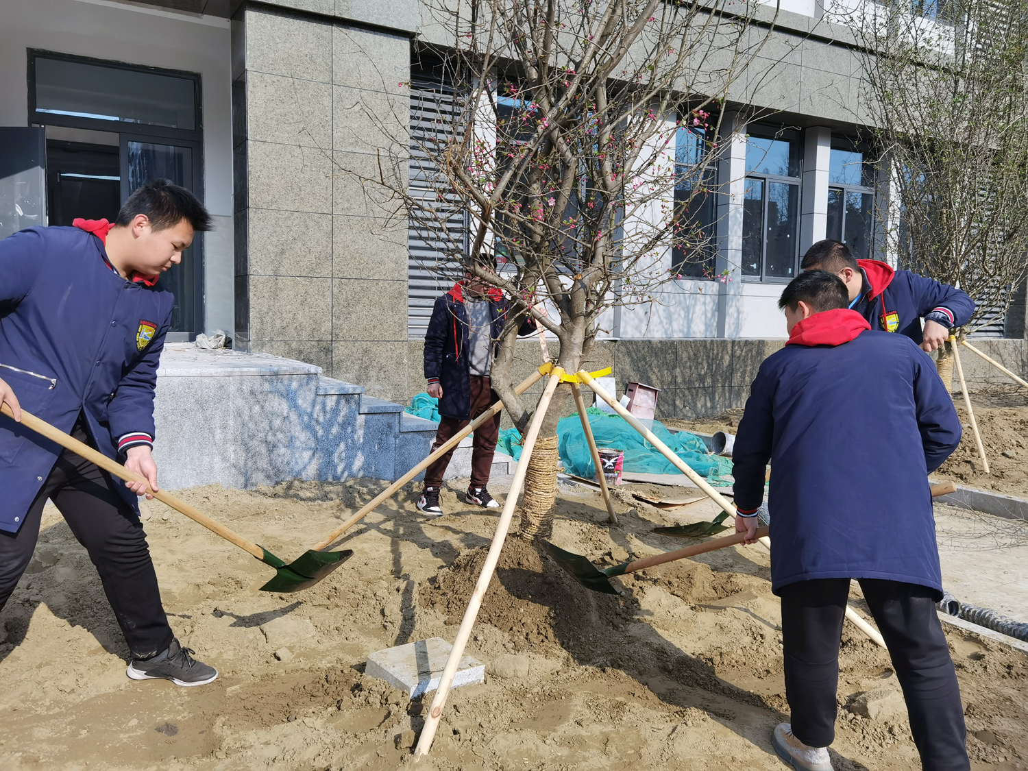 从分小组、领植树工具、找种植区到培土、浇水、剪枝,同学们欢声笑语,朝气蓬勃,奔波忙碌,跑前跑后。几位校长带领同学们一起培土、压实、浇水,动作娴熟,指导着同学们怎样下铁锹、怎样夯实土、怎样浇灌水。大家也便有模有样地跟在后面学习着。