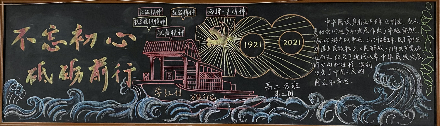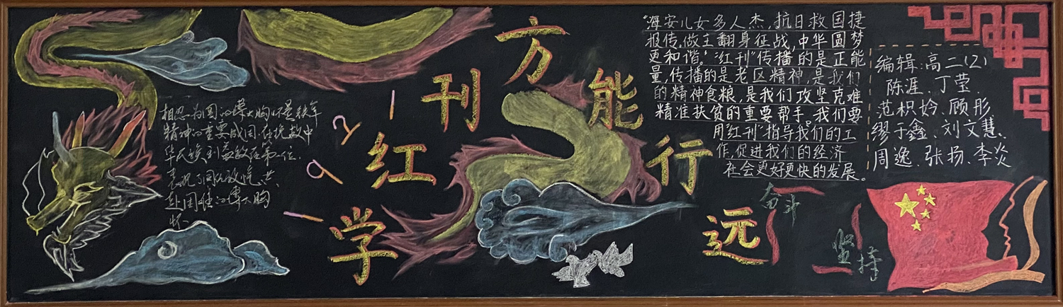 为迎接中国共产党建党百年华诞,展示学校“学党史 学红刊”主题教育活动成果,激发学生的民族自尊心、自信心和自豪感,培育以爱国主义为核心的民族精神和以改革创新为核心的时代精神,海安中学高一年级以“学党史,心有所信”为主题,高二年级以“学红刊,方能行远”为主题开展了黑板报评比活动。