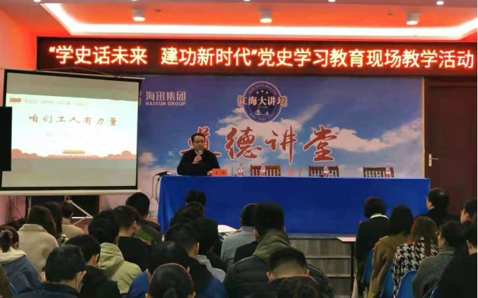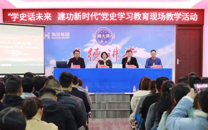 4月15日上午,由海安市教体局和海安市总工会共同举办的“咱们工人有力量”海陵职工学堂主题思政课宣讲系列活动在江苏海迅实业集团股份有限公司举行,这是该主题活动的首场宣讲。活动由海迅集团工会主席贲可梁主持,市总工会党组书记、副主席柴宝清出席、海安中学工会主席顾宏彬代表市教育工会参加活动。近百名企业职工代表参加了学习活动。
