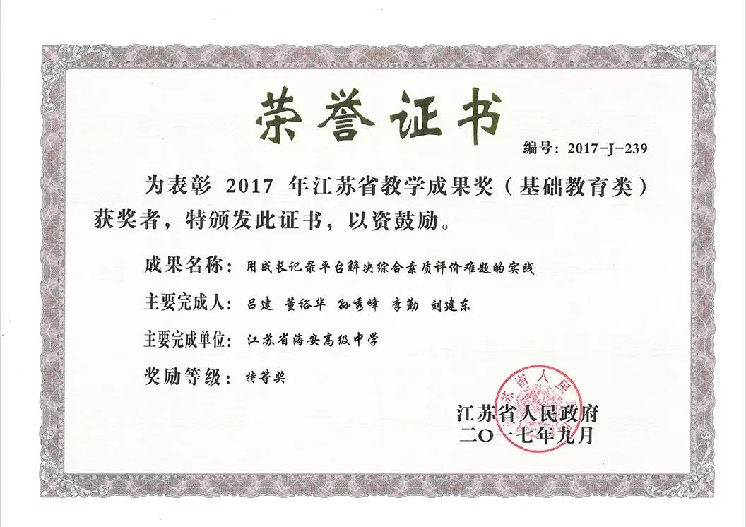 该项目2014年入选教育部基础教育二司《中小学生综合素质评价案例集》;2017年获全国教育改革创新典型案例优秀校长奖,江苏省教学成果特等奖;2018年获国家级教学成果奖二等奖。江苏省教育厅以海安中学做法为基础,构建省普通高中综合素质评价管理平台。项目的实施,带动了学生综合素质的全面提升和整体办学水平的稳步攀升,学校成为全省首批高品质示范高中立项建设学校,获评“全国未成年人思想道德建设工作先进单位”。