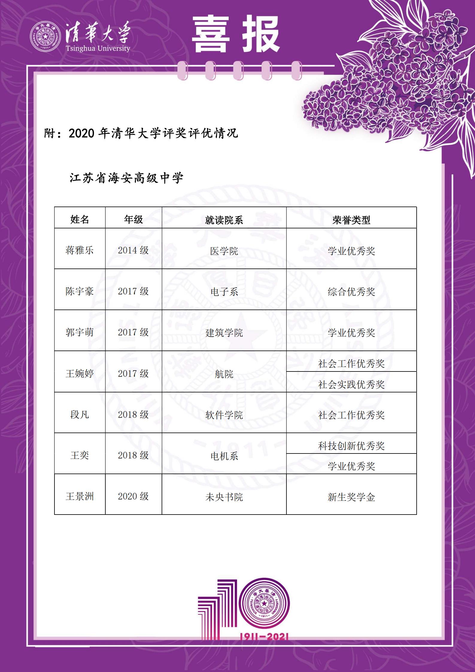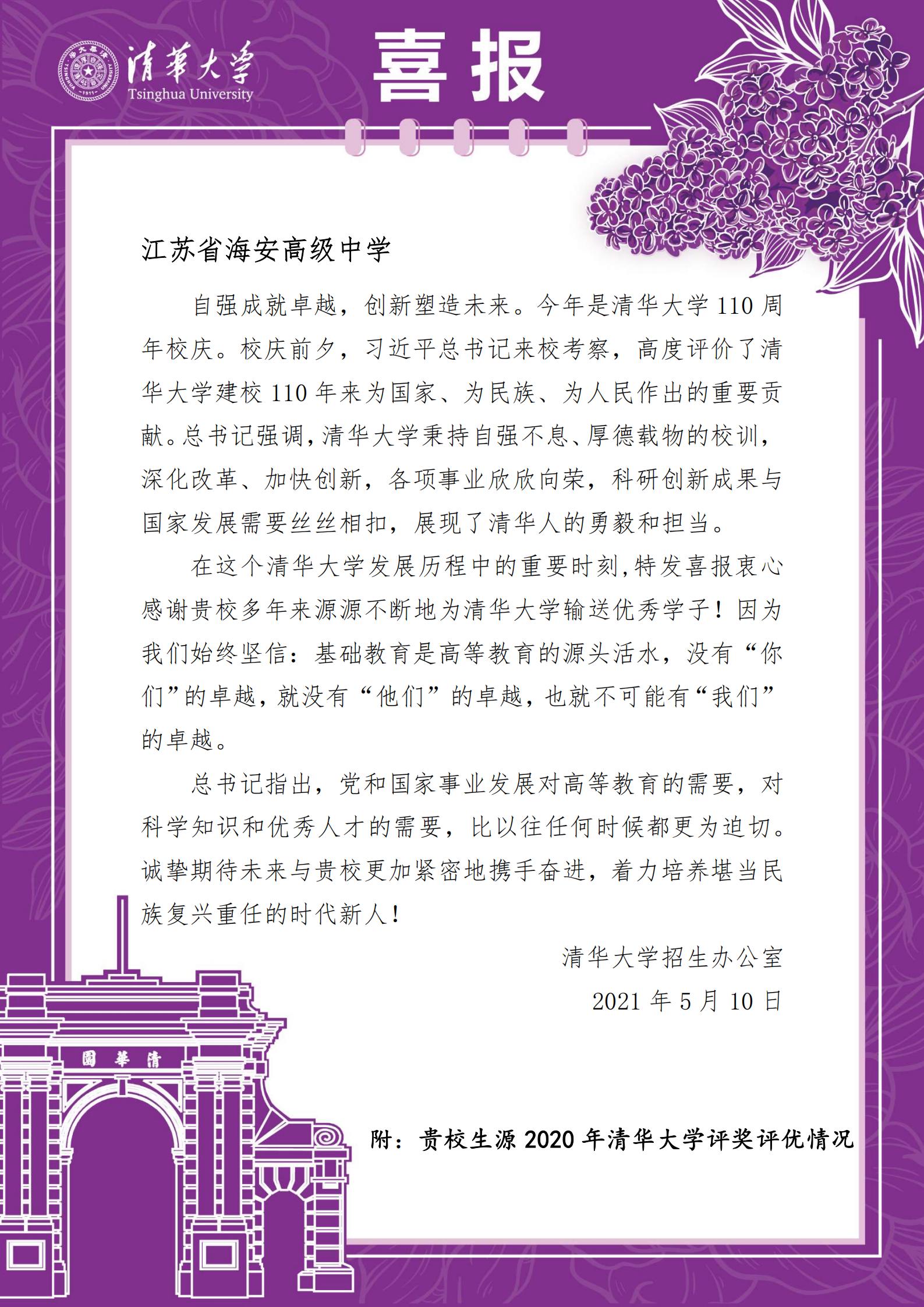 2021年5月10日,清华大学在建校110周年之际,向我校发来喜报,祝贺我校毕业生在清华大学2020年评奖评优中获各类表彰,对我校多年来源源不断地为清华大学输送优秀生源表示感谢,并期待未来与我校更加紧密地携手奋进,着力培养堪当民族复兴重任的时代新人。