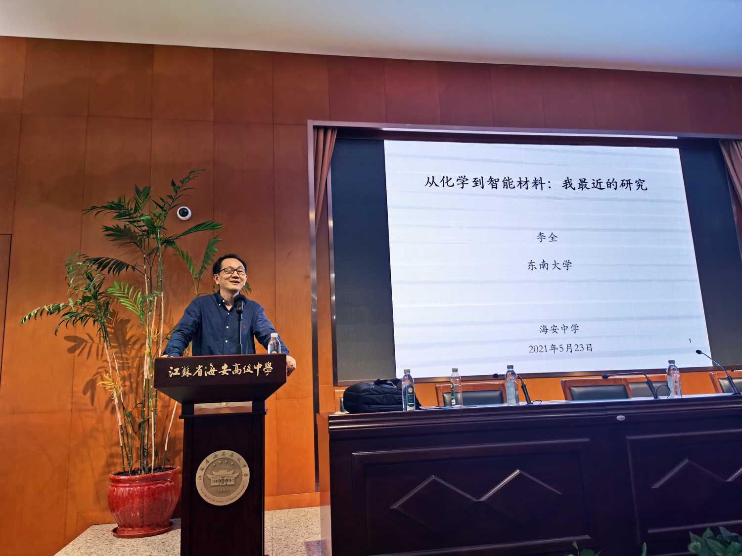 2021年5月23日,东南大学化学化工学院党委书记孙岳明,化学化工学院院长周建成,化学化工学院欧洲科学院院士李全,能源与环境学院党委书记蔡亮,东南大学招办主任、教务处副处长张力,化学化工学院党委副书记兼副院长汤顶华等一行10人来海安中学考察交流,海中党委书记、校长吕建,副校长杨斌、吴明山等热情接待了东南大学来宾。
