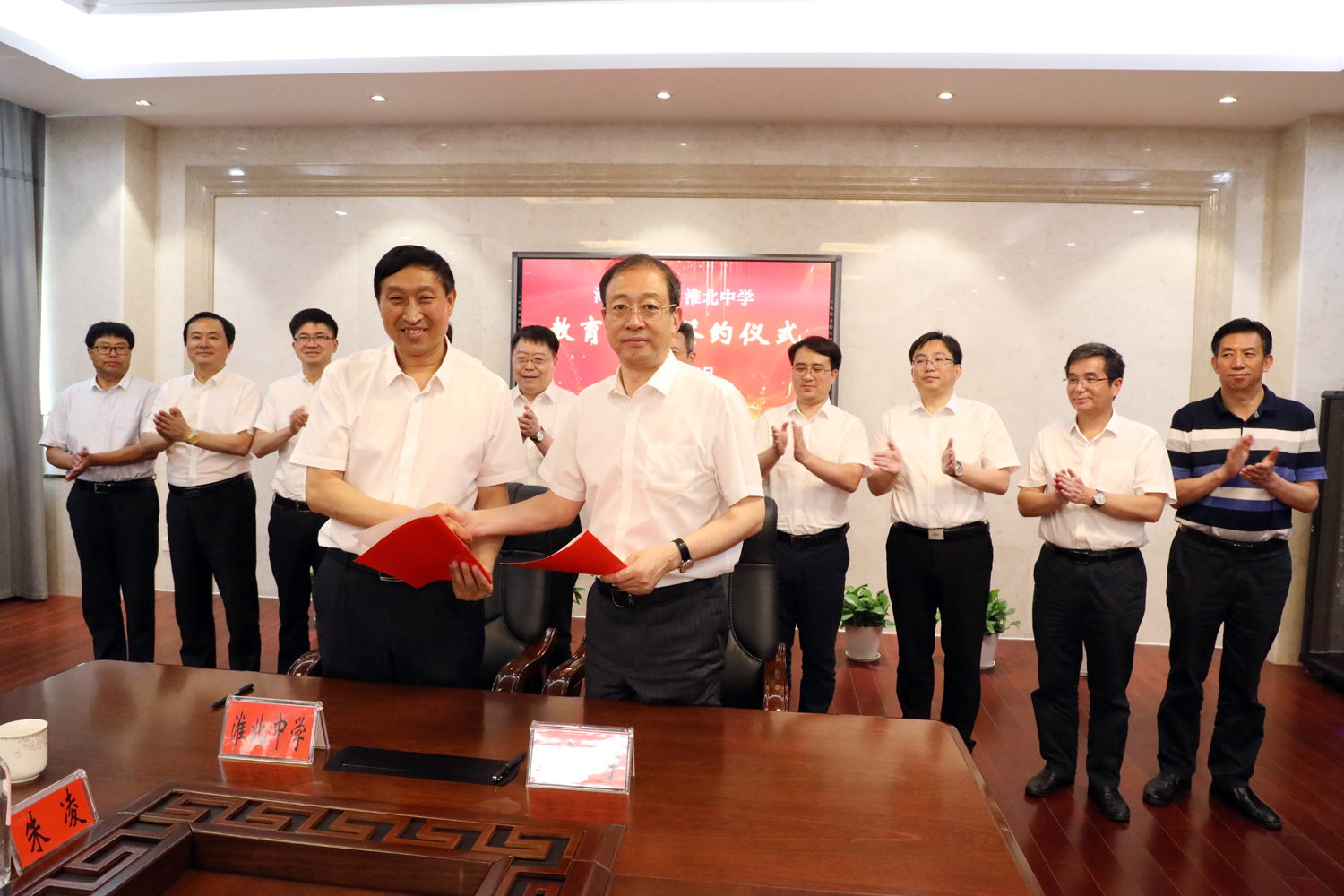 在全体领导和来宾的见证下,江苏省海安高级中学校长吕建和江苏省淮北中学校长孙家柱共同签署了两校教育合作协议。