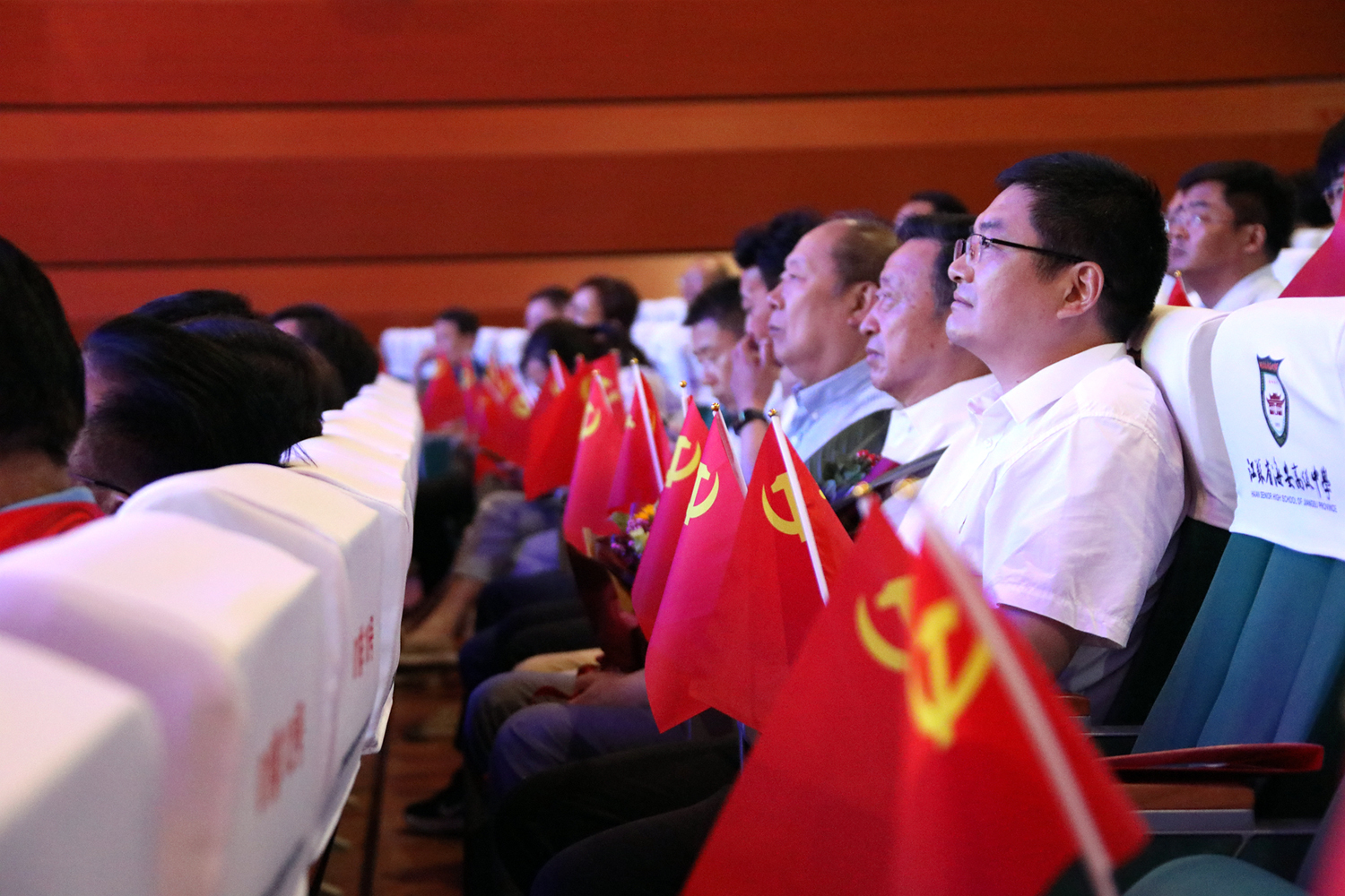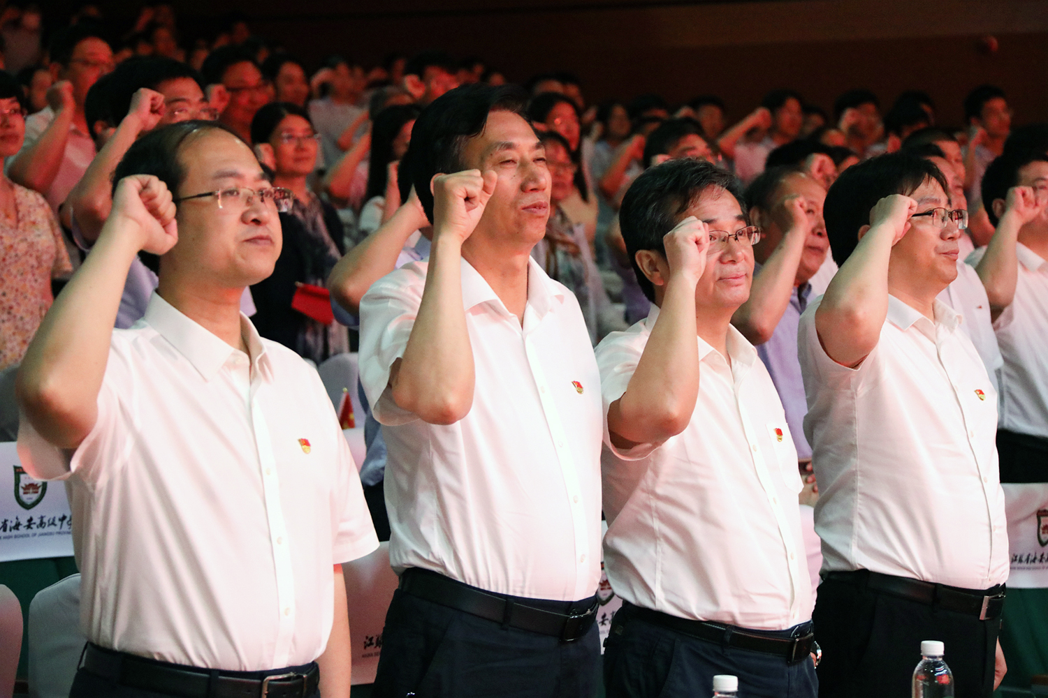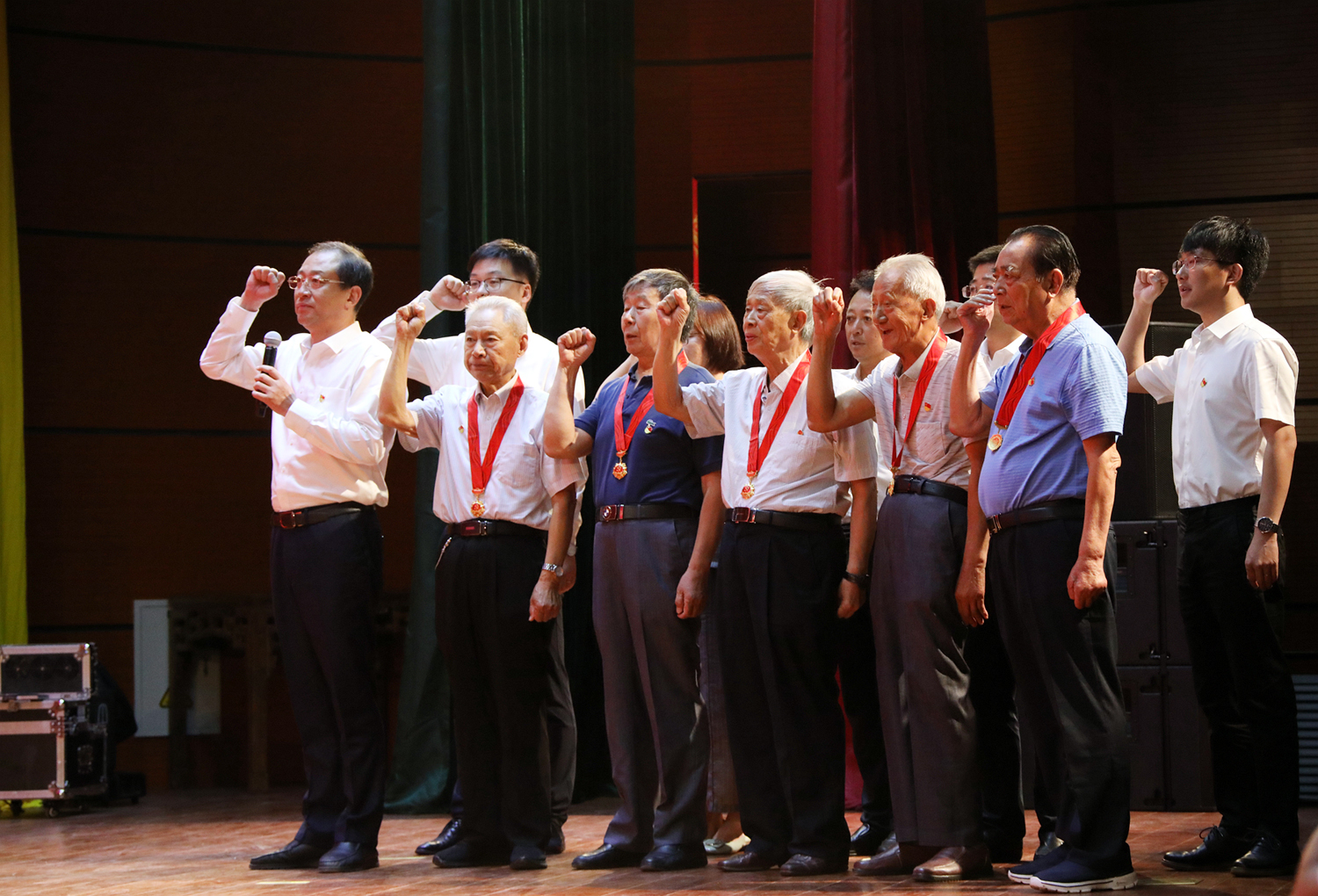 党委书记、校长吕建和“光荣在党50年”奖章获得者代表带领新党员宣誓