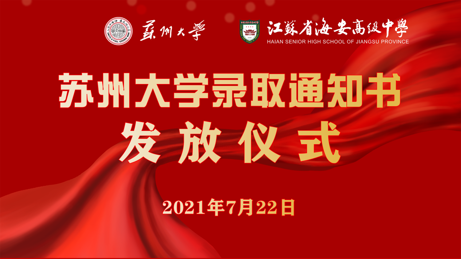 苏州大学党委常委、副校长陈卫昌向海安中学颁发了喜报,并向每一位新生颁发录取通知书。