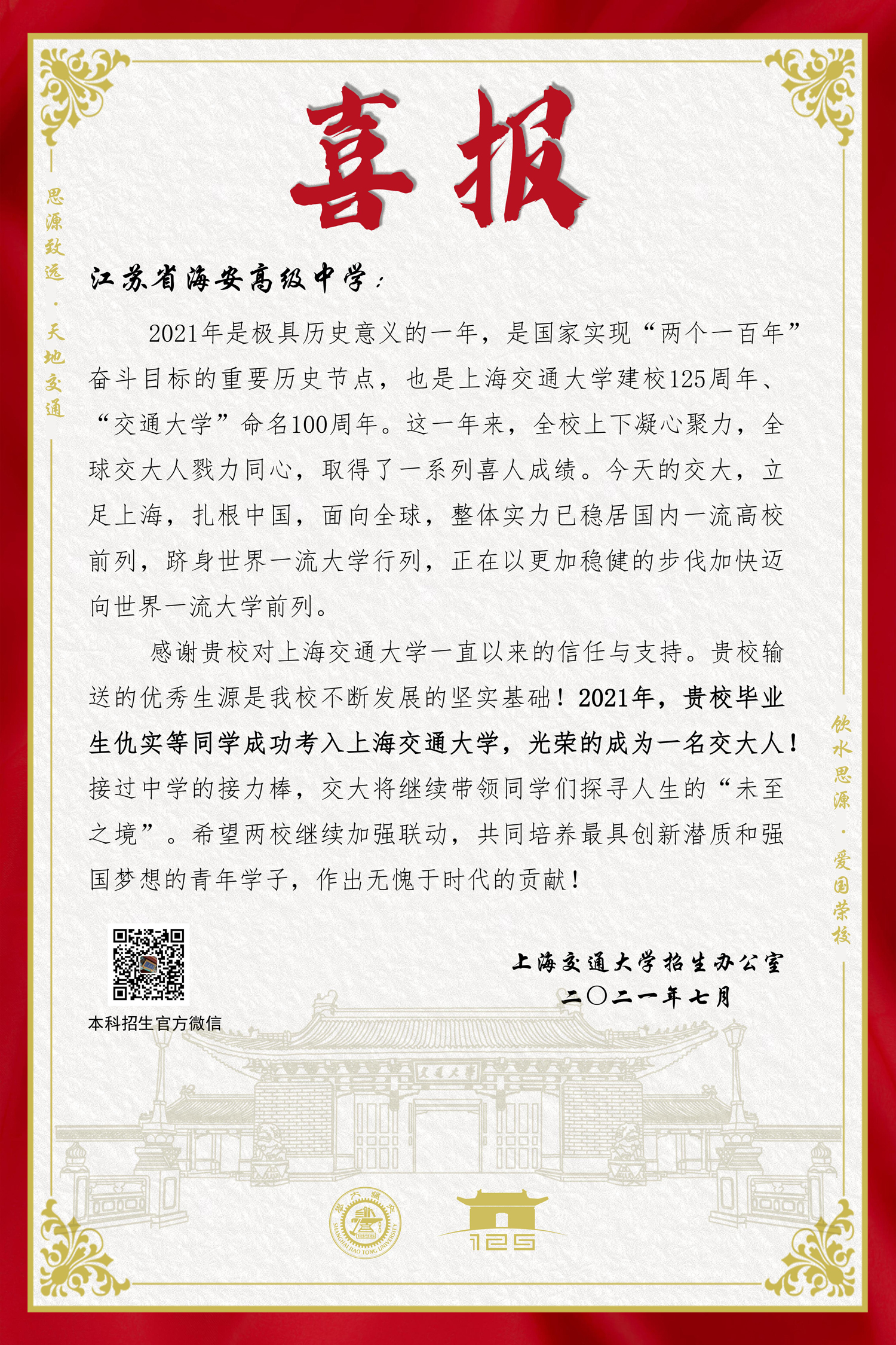 上海交通大学向我校发来喜报!