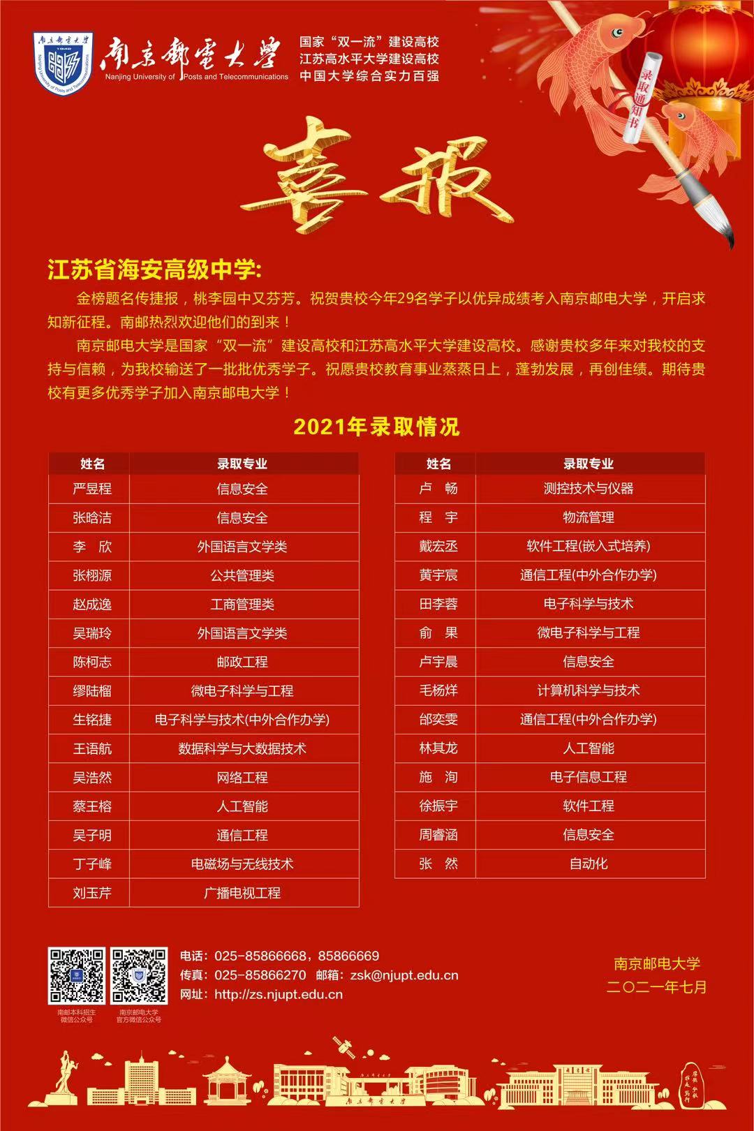 南京邮电大学向我校发来喜报 来源: 发布时间:2021-07-24 00:00:00 浏览次数: 次 【字体:小 大】 近日,南京邮电大学向我校发来喜报,祝贺我校2021届29名学子以优异成绩考入南京邮电大学,开启求知新征程。同时感谢我校多年来对南邮的支持与信赖,为南邮输送了一批批优秀学子。祝愿我校教育事业蒸蒸日上,蓬勃发展,再创佳绩! 分享到: 【打印正文】