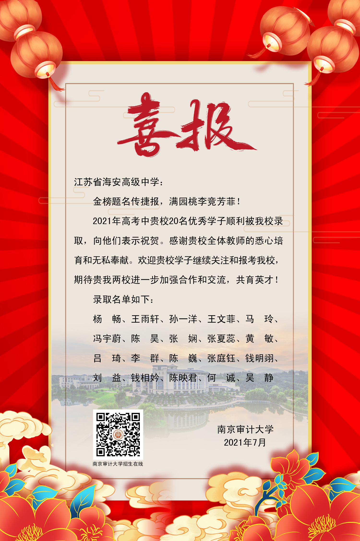 南京审计大学向我校发来喜报 来源: 发布时间:2021-07-29 00:00:00 浏览次数: 次 【字体:小 大】 近日,南京审计大学向我校发来喜报,祝贺我校2021届20名学子考入南京审计大学,同时感谢我校全体教师的悉心培育和无私奉献,期待两校进一步加强合作与交流,共育英才! 分享到: 【打印正文】
