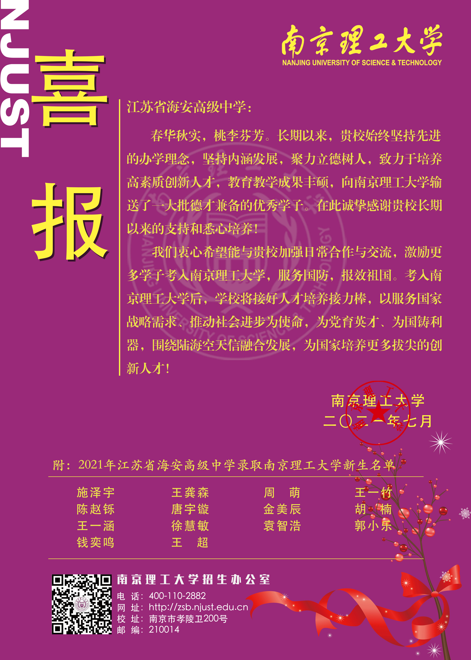 南京理工大学向我校发来喜报 来源: 发布时间:2021-07-31 00:00:00 浏览次数: 次 【字体:小 大】 近日,南京理工大学向我校发来喜报,祝贺我校2021届14名优秀学子考入南京理工大学。同时感谢我校长期以来向南京理工大学输送了一大批德才兼备的优秀学子,希望与我校加强合作与交流,为国家培养更多拔尖的创新人才。希望同学们以服务国家战略需求、推动社会进步为使命,早日成长为素质全面的高质量人才。 分享到: 【打印正文】