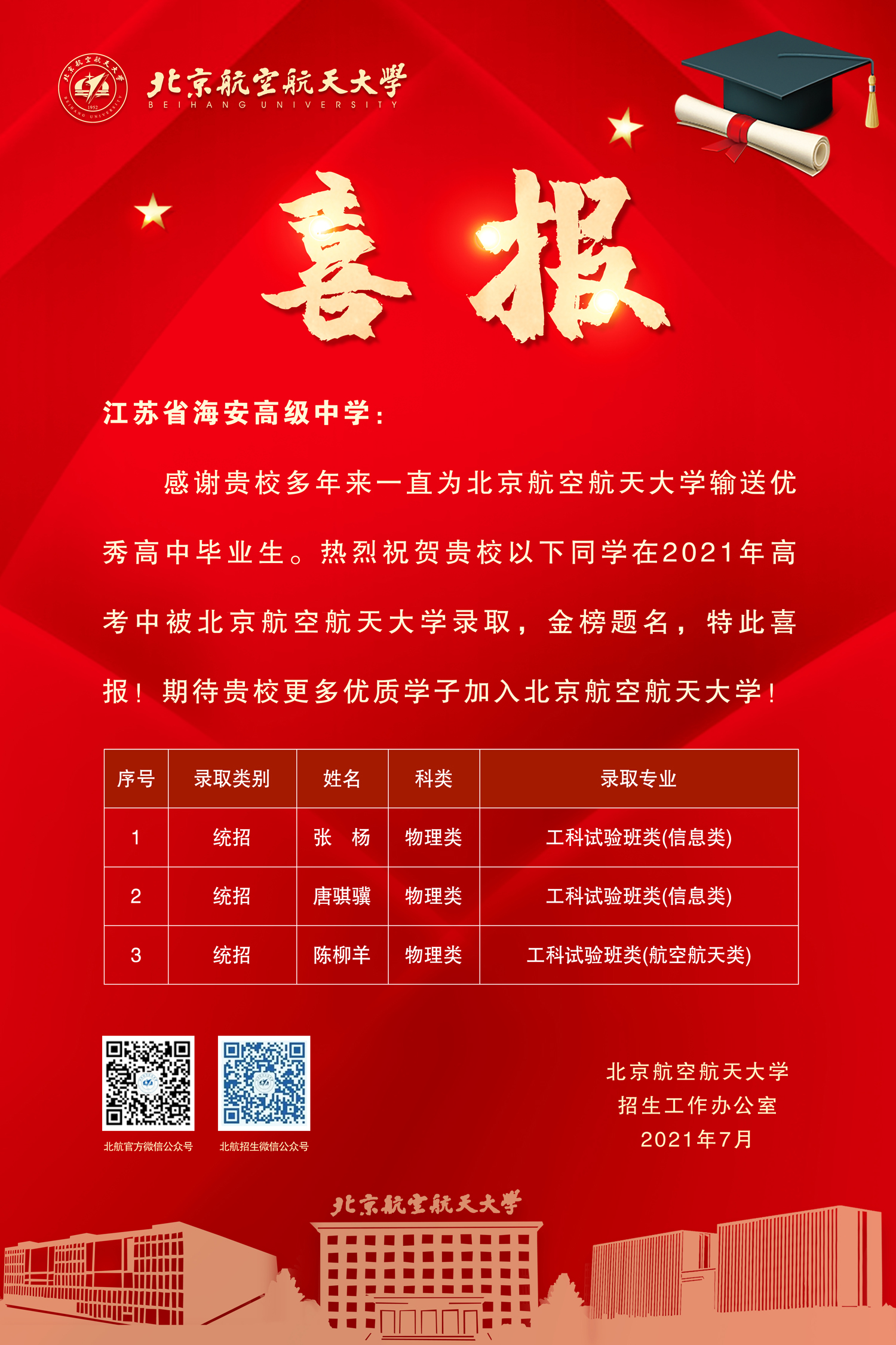 北京航空航天大学向我校发来喜报