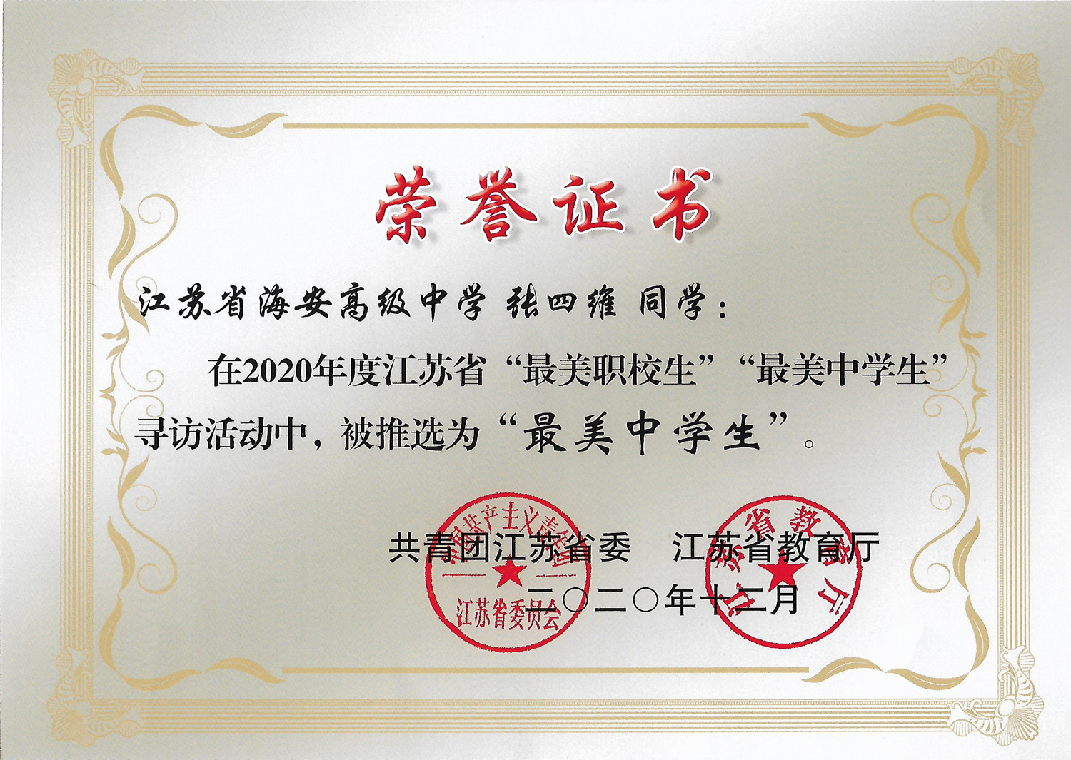 共青团江苏省委、江苏省教育厅公布2020年全省寻访“最美中学生”“最美职校生”活动结果。江苏省海安高级中学张四维同学、卢译同学荣获2020年江苏省“最美中学生”称号。