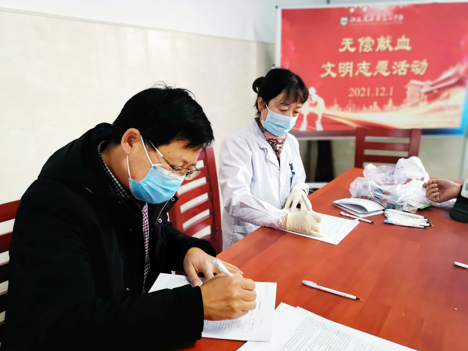 12月1日,寒潮侵袭下的海中校园暖意融融,作为临时献血屋的海中团校人流络绎不绝,他们有的刚上完一节课立即赶来,有的一献完血就匆匆赶去上课,有的身上还带着食堂灶头的菜香……他们来自于学校的各个岗位,他们怀揣着共同的愿望“无私奉献热血,点燃生命希望”。