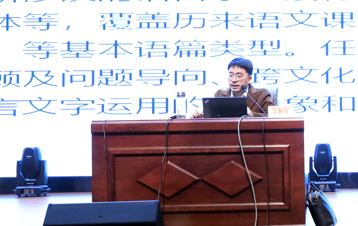 如皋市语文教研员杜新建做了《对高中语文“学习任务群”的思考》的主题报告。他阐述了“学习任务群”的理论依据、基本特点,学习方式的多元化、“任务群”教学的“四主”原则等理论知识,并辅以生动详实的课例介绍,让老师们对“学习任务群”这个概念有了新的认识和思考。他认为,教师应以语文核心素养为纲,以学生的语文实践为主线,认真研读课程标准,更新教学理念,仔细研读教材,制定合理的教学目标,确立正确的教学思路和恰当的教学方法。