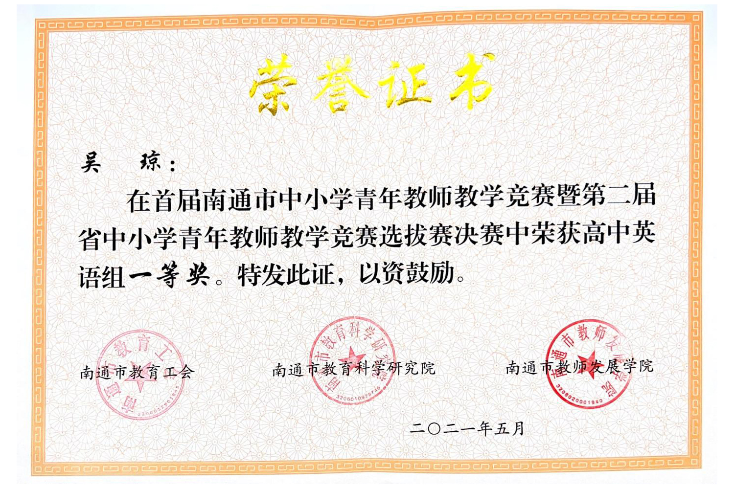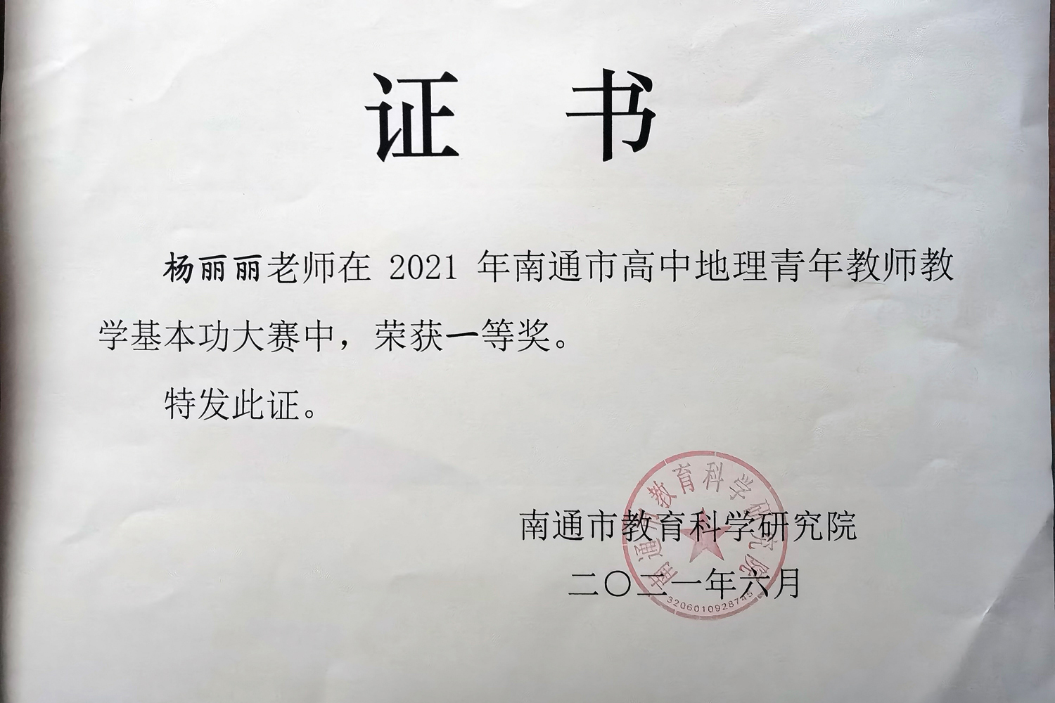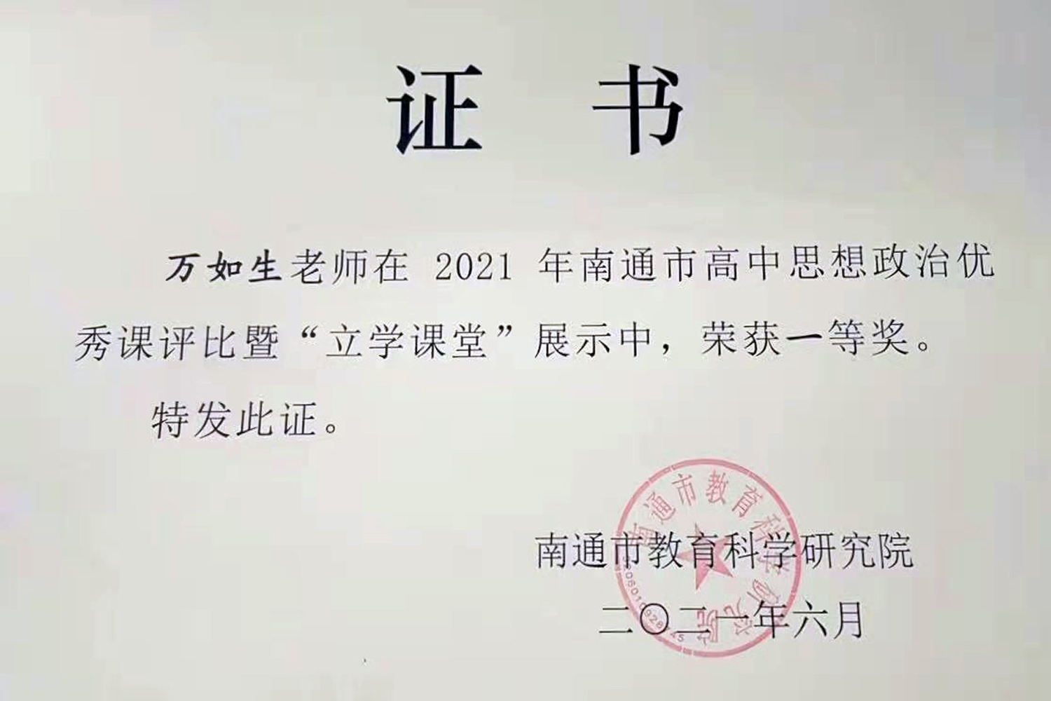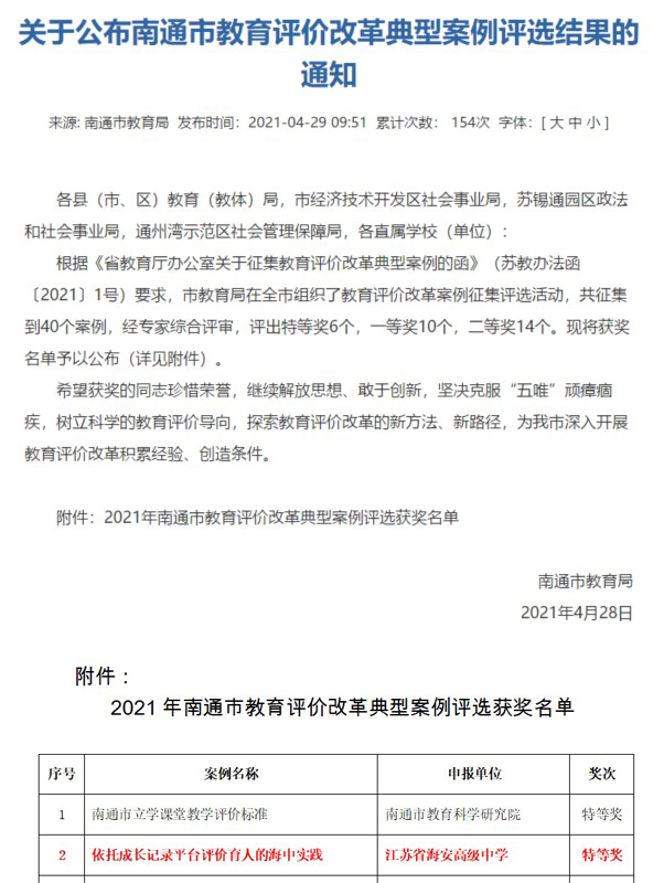 ▲《依托成长记录平台评价育人的海中实践》案例获评南通市特等奖
