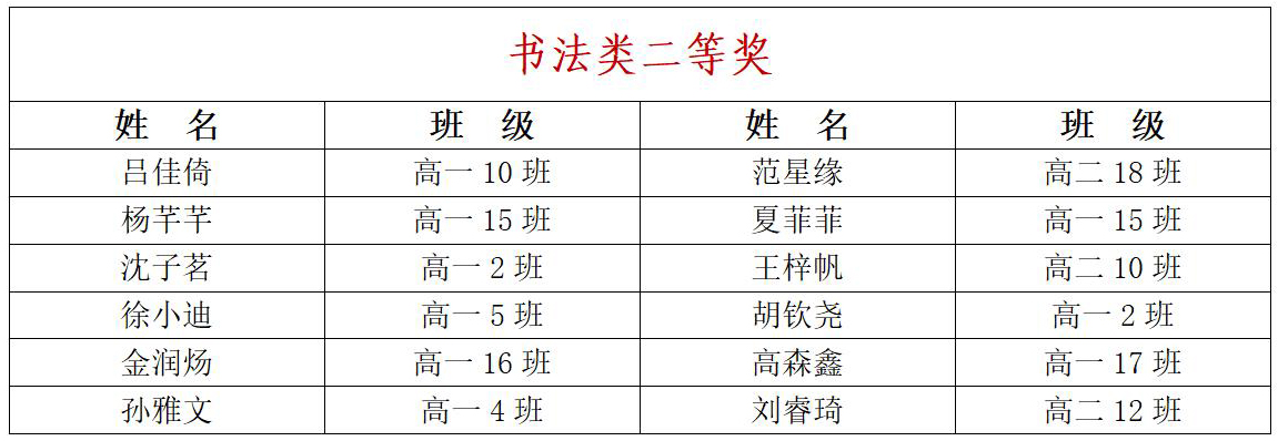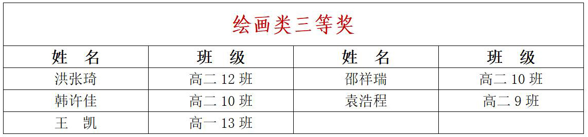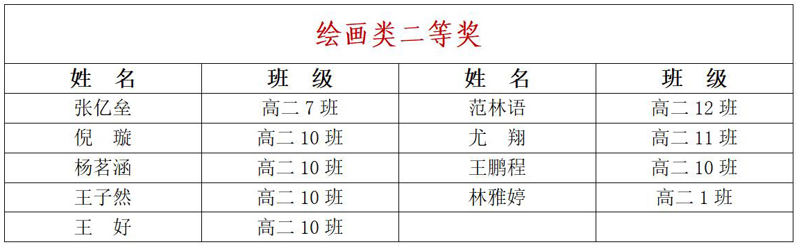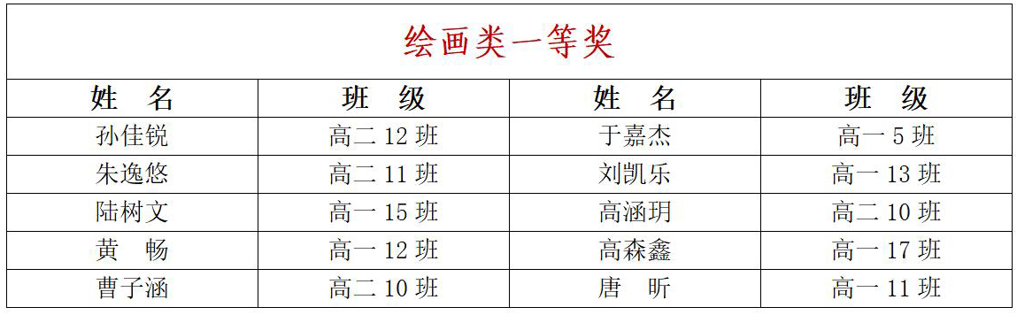 在美术组教师的精心策划下,全校学生积极参与,共收到书法、绘画作品150多幅。经过评委老师们的认真评选,最后共选出书法类一等奖10名,二等奖12名,三等奖23名;绘画类一等奖10名,二等奖9名,三等奖5名。获奖作品将在学生艺术中心展出。