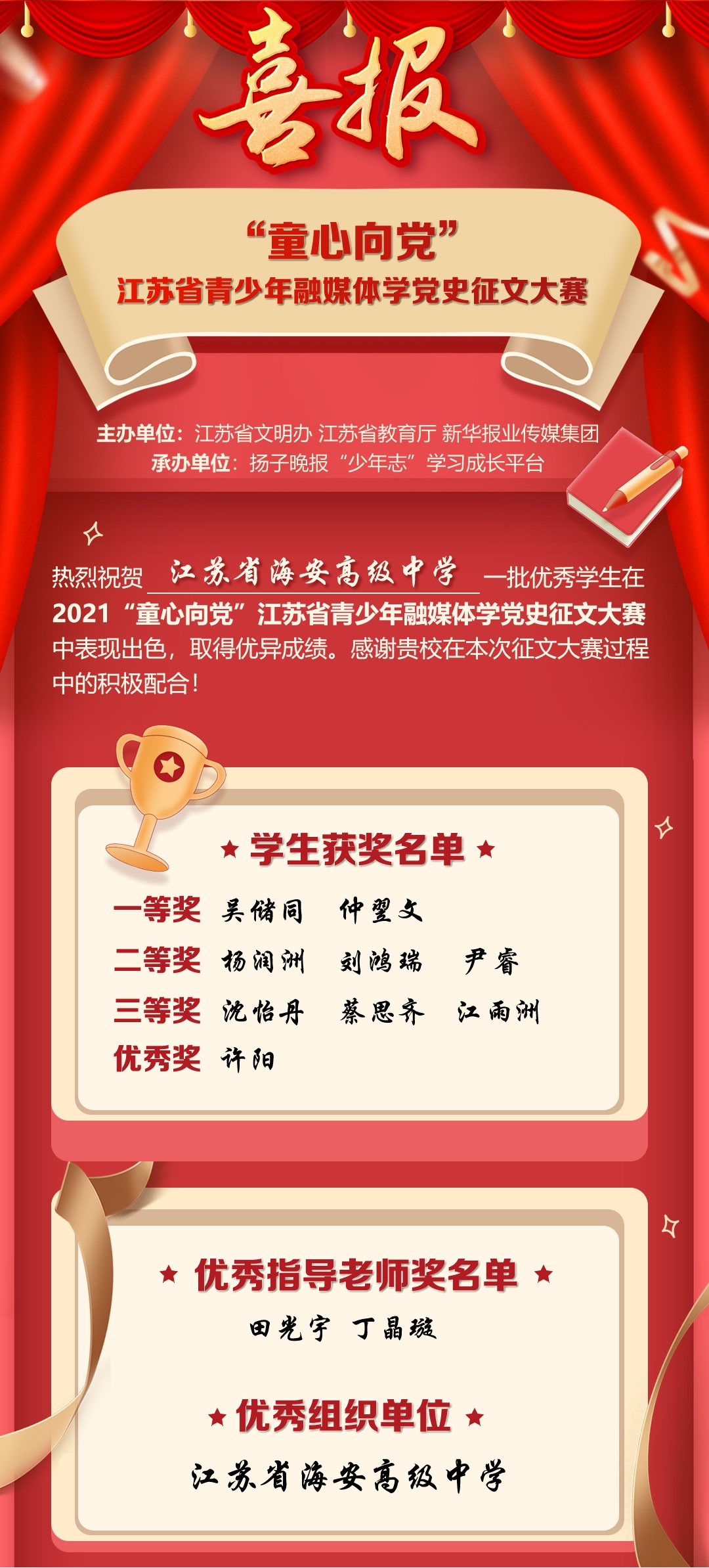16万余名中小学生参加的江苏省“童心向党”征文大赛,海安中学成绩优异。