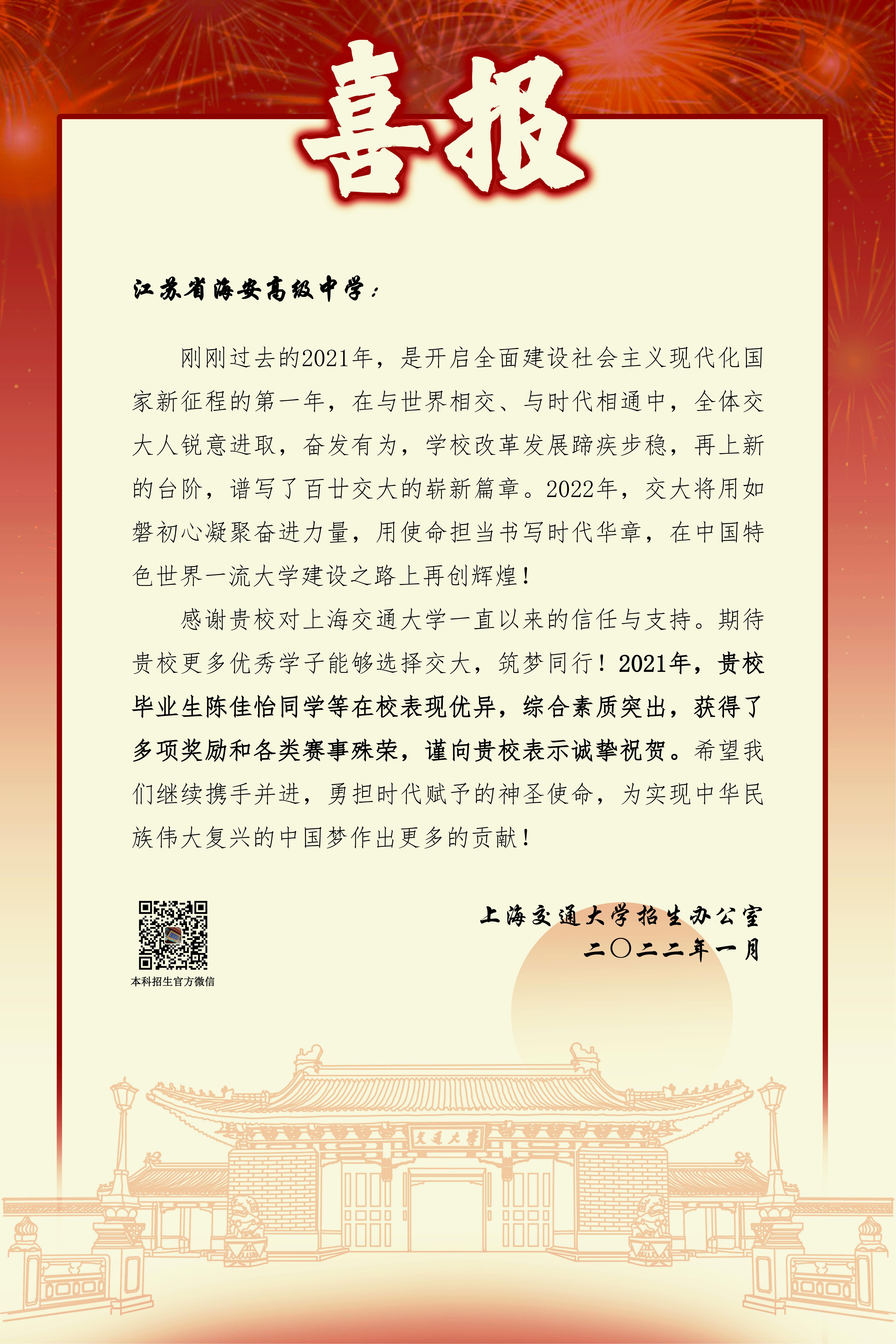 上海交通大学向我校发来喜报 来源:校长办公室 发布时间:2022-01-14 00:00:00 浏览次数: 次 【字体:小 大】 校友传佳绩,母校添荣光!我校收到来自上海交通大学的喜报2021年海中校友获上交大各类奖学金共计32人次充分展示了海中学子强劲的发展潜力和优秀的综合素质同时感谢我校一直以来对交大的信任与支持希望两校携手并进,再创辉煌!向获奖同学表示祝贺!祝愿所有海中校友不忘初心,锐意进取!祝愿所有海中学子胸怀家国,鹏程万里! 分享到: 【打印正文】