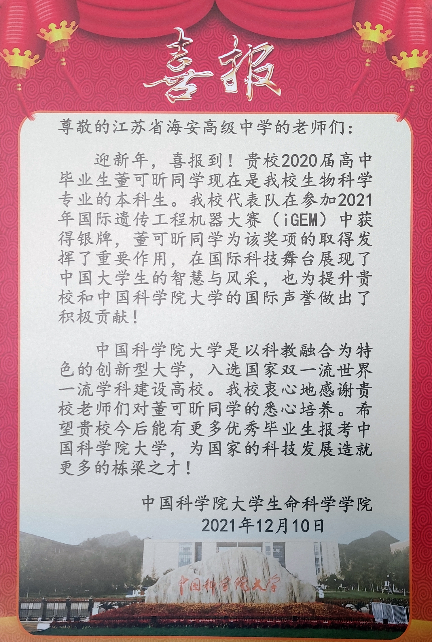 我校校友董可昕获国际遗传工程机器大赛银牌 来源:校长办公室 发布时间:2022-01-20 00:00:00 浏览次数: 次 【字体:小 大】 中国科学院大学向我校发来喜报在合成生物学领域的顶级国际性学术竞赛国际遗传工程机器大赛(iGEM)中我校2020届校友董可昕与中科大参赛团队一道斩获银牌展现了我校校友的智慧与风采!希望所有海中学子以优秀校友为榜样追寻热爱,探索世界在接续奋斗中汇聚国家强盛发展的磅礴力量! 分享到: 【打印正文】