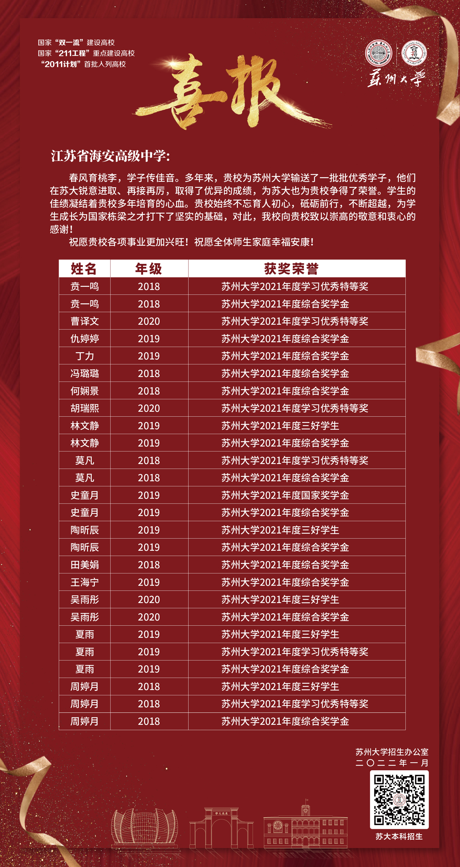 苏州大学向我校发来喜报 来源:校长办公室 发布时间:2022-01-21 00:00:00 浏览次数: 次 【字体:小 大】 春风育桃李,学子传佳音!我校收到来自苏州大学的喜报2021年海中校友锐意进取,奋力拼搏获苏大各类奖学金共计26人次并感谢我校长期以来对苏大的支持向获奖同学表示祝贺!期待你们深耕学业,再创佳绩! 分享到: 【打印正文】