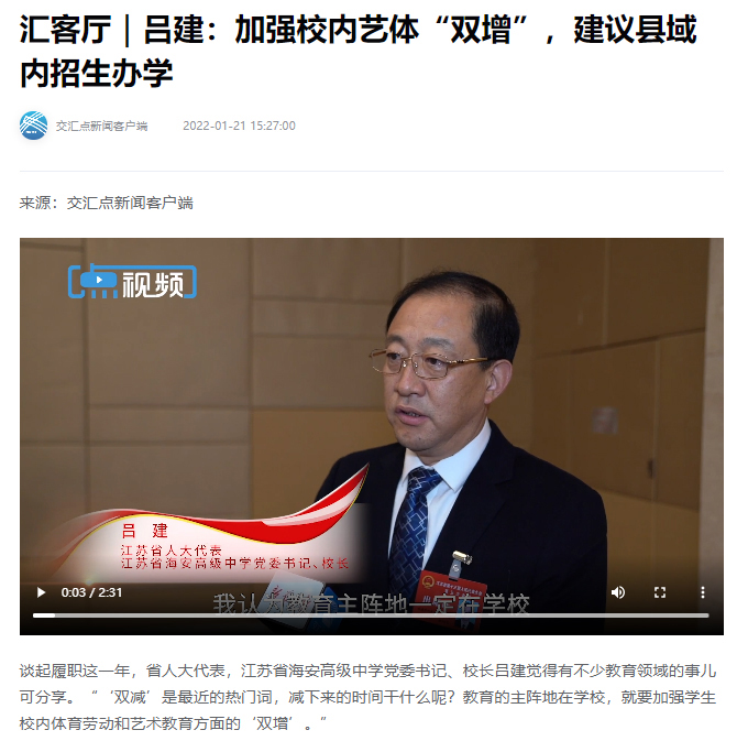 1月21日,在宁参加省两会的省人大代表、我校党委书记、校长吕建接受新华日报记者访谈,畅谈艺体“双增”、县中振兴,让我们一起看看来自新华日报交汇点的报道。