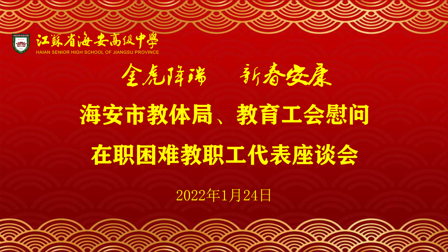 1月24日上午,寅虎新春即将来临之际,海安市教体局副局长万芝峰、基教科科长郑明达、教育工会副主席李进一行来到我校,送来了市教体局党委、教育工会对我校困难教职工的亲切关怀和节日祝福。慰问座谈会在奥林匹克楼第二会议室召开,我校党委书记、校长吕建,副校长董裕华、吴明山,工会主席顾宏彬以及困难职工出席慰问座谈会。