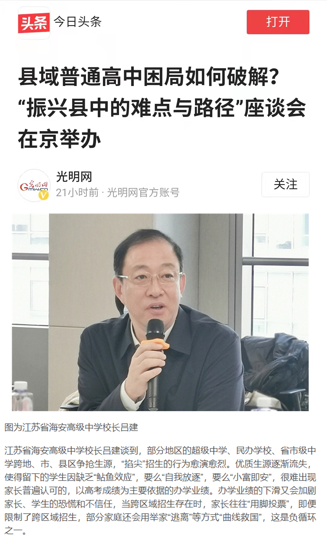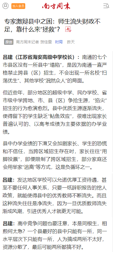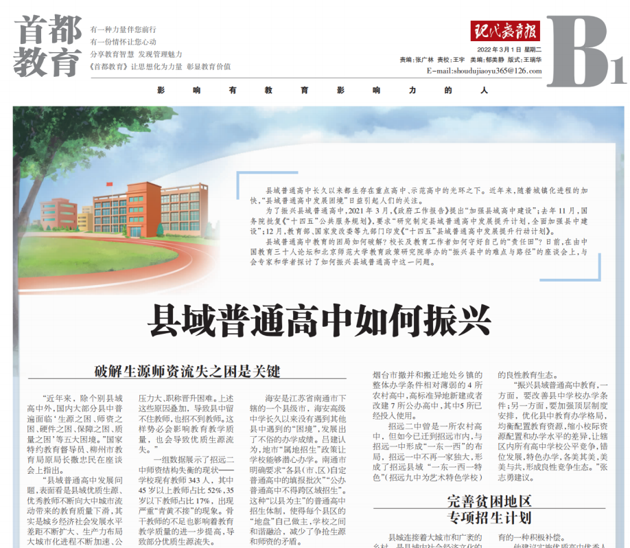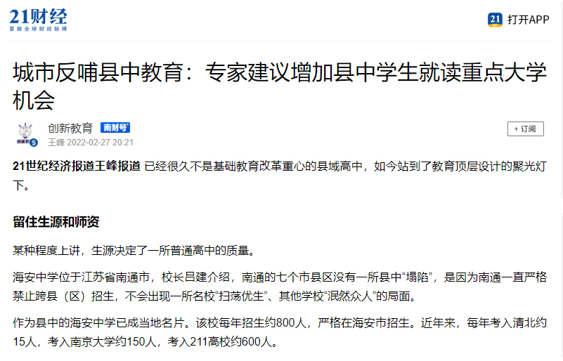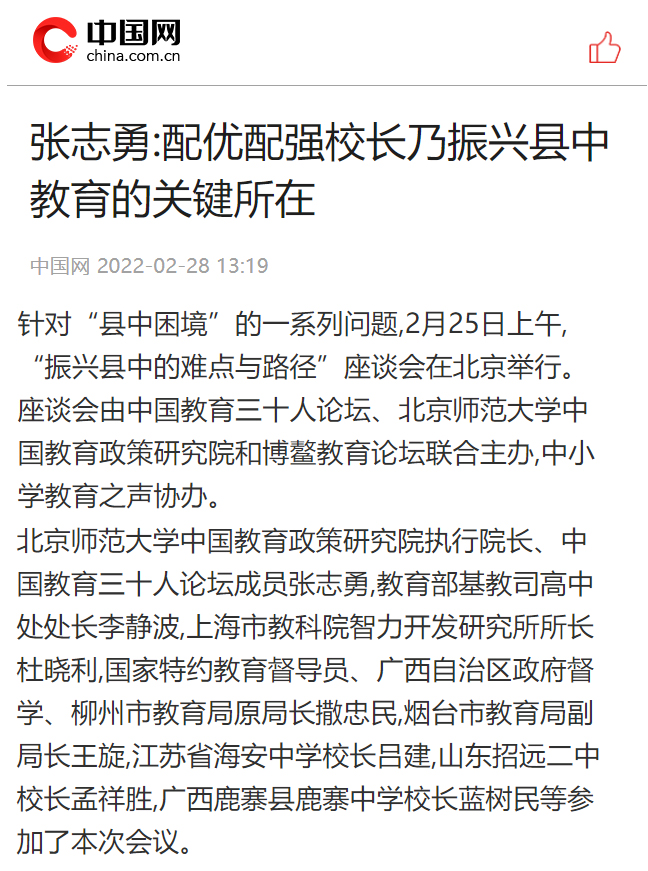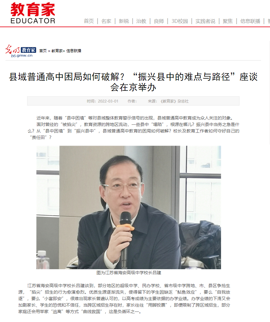 2月25日,海安中学党委书记、校长吕建应邀出席由中国教育三十人论坛、北京师范大学中国教育政策研究院和博鳌教育论坛联合主办的“振兴县中的难点与路径”座谈会。座谈会上,吕建校长以《振兴县中必须重塑教育生态》为题,剖析了县中的衰落乃至“坍塌”的核心因素,并以南通、海安地区及海安中学教育高质量发展实践为例,提出破解之道,引发广泛的社会反响,新京报、21财经、澎湃新闻、界面新闻、搜狐、腾讯、新浪、网易、中国网、环球网、今日头条、现代教育报、南方周末、光明网等各大主流媒体纷纷报道海中的成功实践。