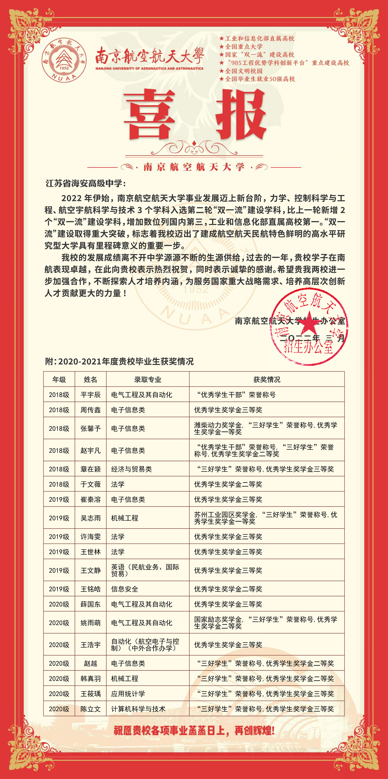 南京航空航天大学向我校发来喜报 来源:校长办公室 发布时间:2022-03-25 00:00:00 浏览次数: 次 【字体:小 大】 在这梅蕊摇红、玉柳成行的美好时节我校收到来自南航的喜报2020-2021年度海中校友表现卓越获南航各类表彰、奖学金共计32人次同时感谢我校一直以来对南航的支持和信任希望两校进一步加强合作不断探索人才培养内涵为国家贡献更大的力量 分享到: 【打印正文】