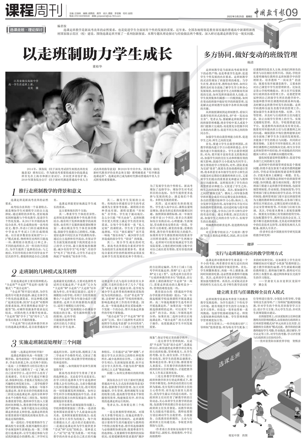 二是完善学生管理机制。无论是“半走班”还是“混合走班”,选课走班以后,新组建的走班教学班比原先的行政班松散,管理难度大,从学生的考勤、安全、座位安排、卫生值日、作业收发,到学生的思想品德教育、集体观念培养,事无巨细,都需要有人来落实。只有教学班的教师和行政班的班主任密切配合,才能把教书育人工作真正落到实处。