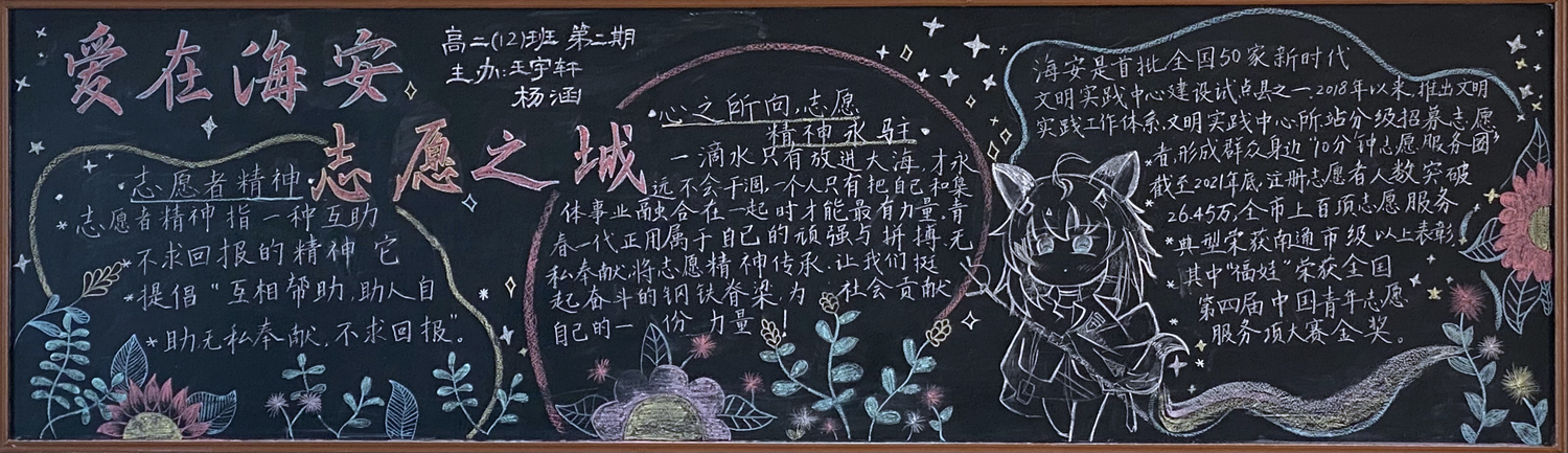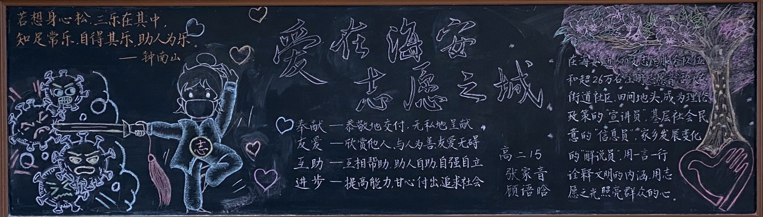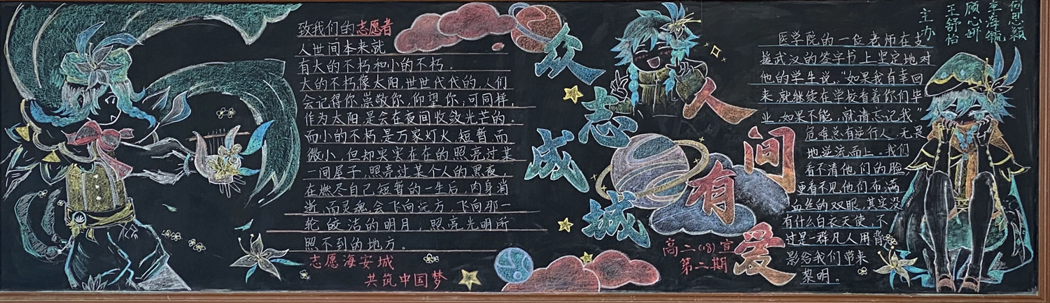 人间真情,大爱无疆。通过这期黑板报的策划,我们深刻领悟到了志愿精神的崇高;在出黑板报的过程中,也体会到了团结互助的力量。这汩汩暖流与无私,为我们注入了不可忘却的时代强音!很感谢学校和老师能够给我们一次这样的机会,使我们的综合能力得到锻炼,收获颇丰。