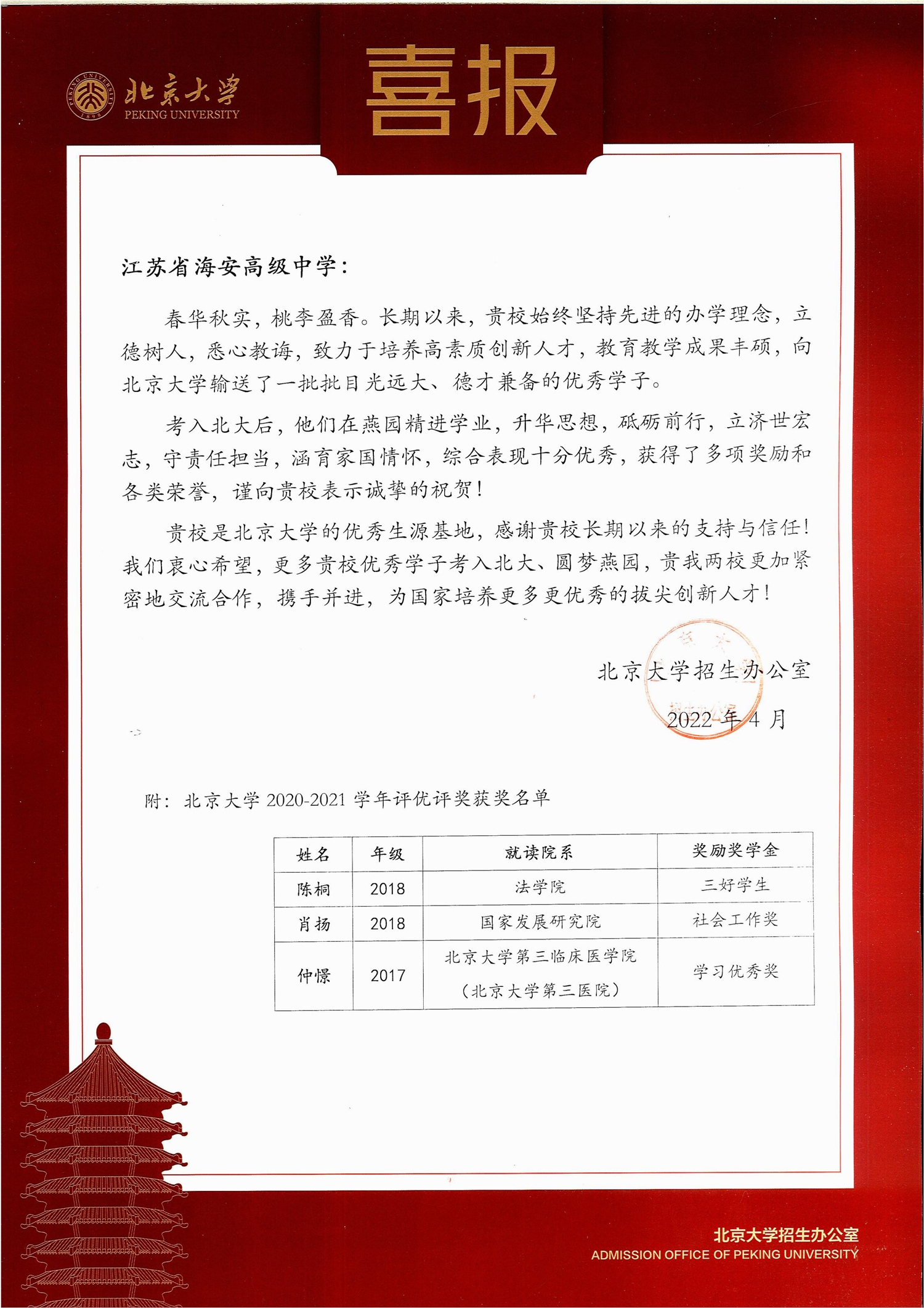 北京大学向我校发来喜报 来源:校长办公室 发布时间:2022-04-13 00:00:00 浏览次数: 次 【字体:小 大】 春风传捷报桃李竞芬芳北京大学向我校发来喜报感谢我校作为北大的优秀生源基地向燕园输送了大批优秀学子表彰在燕园求学的海中校友立济世宏志守责任担当获得了多项奖励和各类荣誉希望两校携手并进为国家培养更多更优秀的拔尖创新人才向受表彰的海中校友表示祝贺你们的优异表现极大的鼓舞了正全力冲刺高考的母校学子相信他们定会接续奋斗再创佳绩 分享到: 【打印正文】