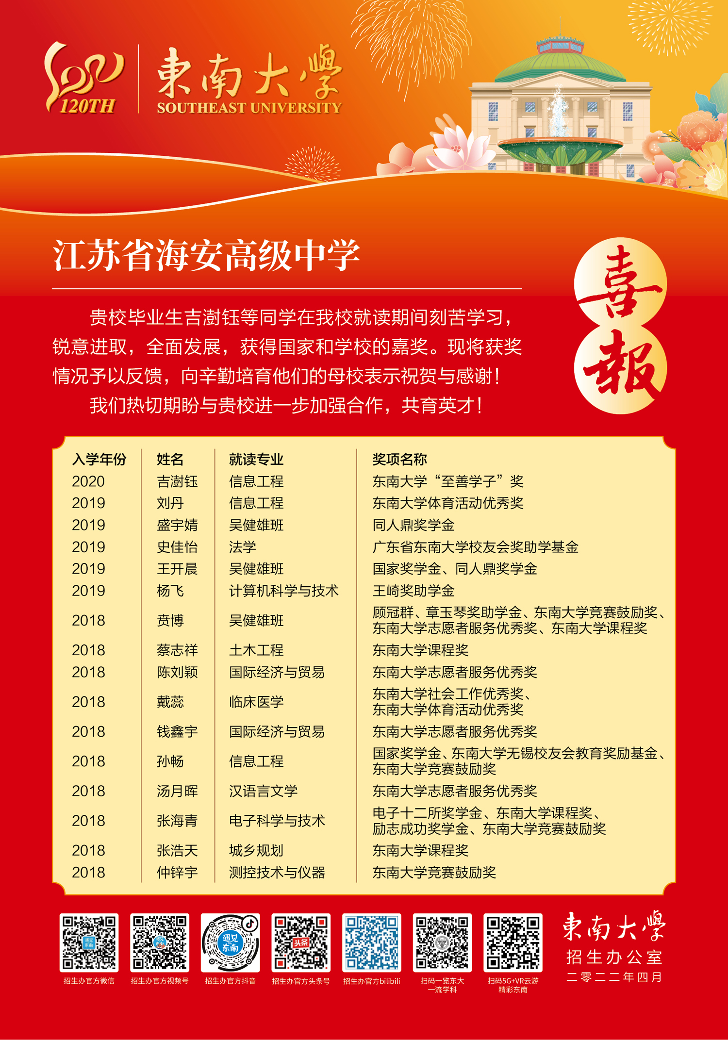 东南大学给我校发来喜报 来源:校长办公室 发布时间:2022-04-21 00:00:00 浏览次数: 次 【字体:小 大】 芳菲四月捷报频传东南大学给我校发来喜报祝贺我校升入东大的校友锐意进取全面发展获国家和学校各类嘉奖共计26人次感谢我校对获奖学子的辛勤培育期盼两校进一步加强合作共育英才向获奖校友表示热烈祝贺祝愿全体高三学子延续胜利再创佳绩 分享到: 【打印正文】