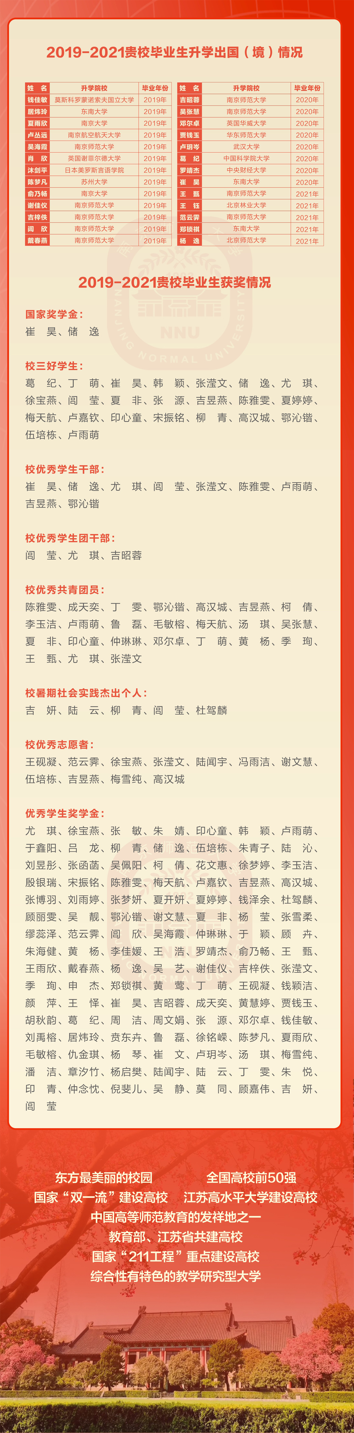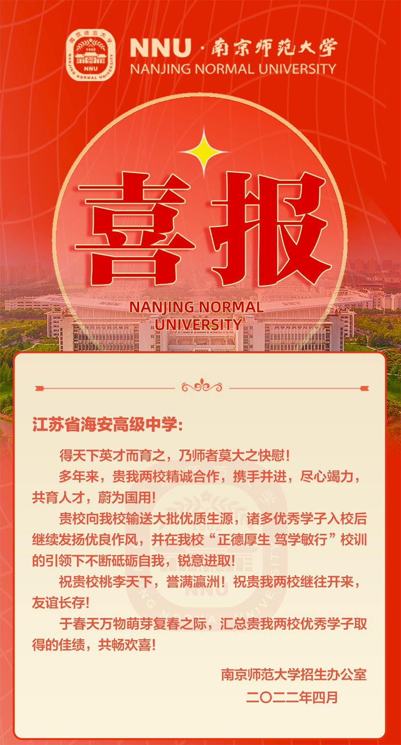 南京师范大学给我校发来喜报 来源:校长办公室 发布时间:2022-04-26 00:00:00 浏览次数: 次 【字体:小 大】 南京师范大学向我校发来喜报2019-2021年海中校友砥砺自我,锐意进取获国家及学校各项奖励共计190人次并有26位校友升入各类高校进一步深造充分展示了海中学子强劲的发展潜力和优秀的综合素质同时感谢我校多年来持续向南师大输送大批优秀生源希望同学们再接再厉学成之后回海安、回母校参与家乡的经济建设和社会发展 分享到: 【打印正文】
