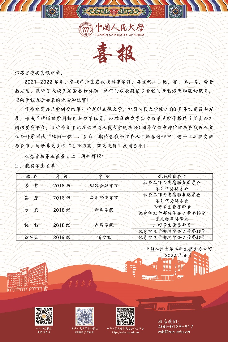 中国人民大学给我校发来喜报 来源:校长办公室 发布时间:2022-05-08 00:00:00 浏览次数: 次 【字体:小 大】 在这唱响劳动赞歌纪念沸腾青春的五月我校收到来自中国人民大学的喜报2021-2022学年海中校友刻苦学习、奋发向上获中国人民大学多项荣誉和奖励希望两校进一步加强交流合作培养更多的复兴栋梁、强国先锋希君生羽翼一化北溟鱼高考的冲锋号已经吹响期待全体高三学子以优秀学长为榜样披荆斩棘破浪前行 分享到: 【打印正文】
