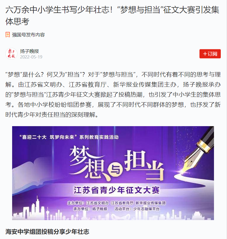 “立其志者,必勇于担当。青年肩上不只有清风和明月,还有责任和担当。”“自当乘梦想之马,挥鞭启程,不负青春韶华。”……本次征文大赛启动后,江苏省海安高级中学的同学们踊跃投稿,用笔尖记录感动,书写自己对“梦想与担当”的理解与思考。他们有的引经据典,有的从小人物的社会担当出发,角度独特,内容丰富,在活动平台少年志APP,这些作文获得了众多网友的点赞与分享。