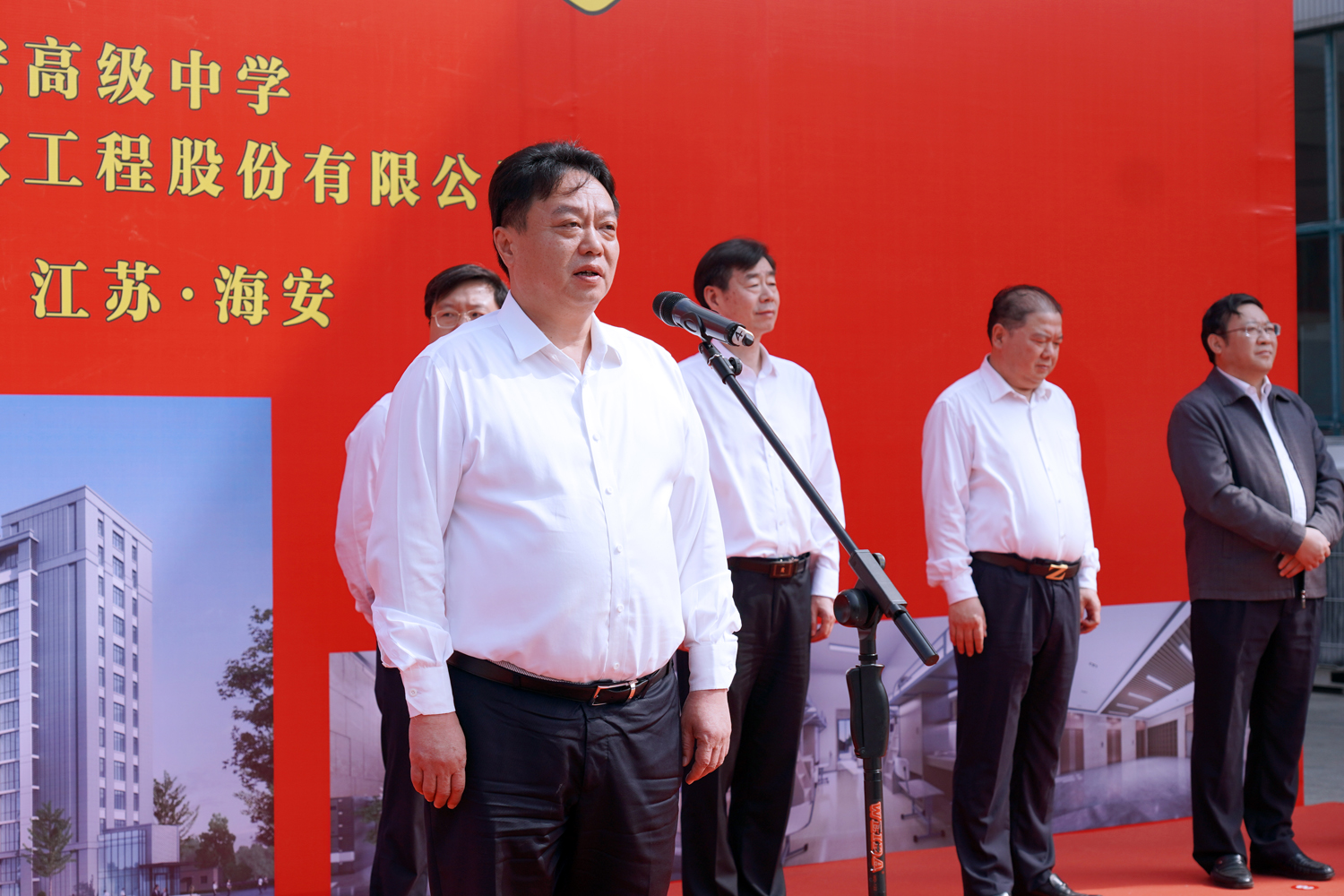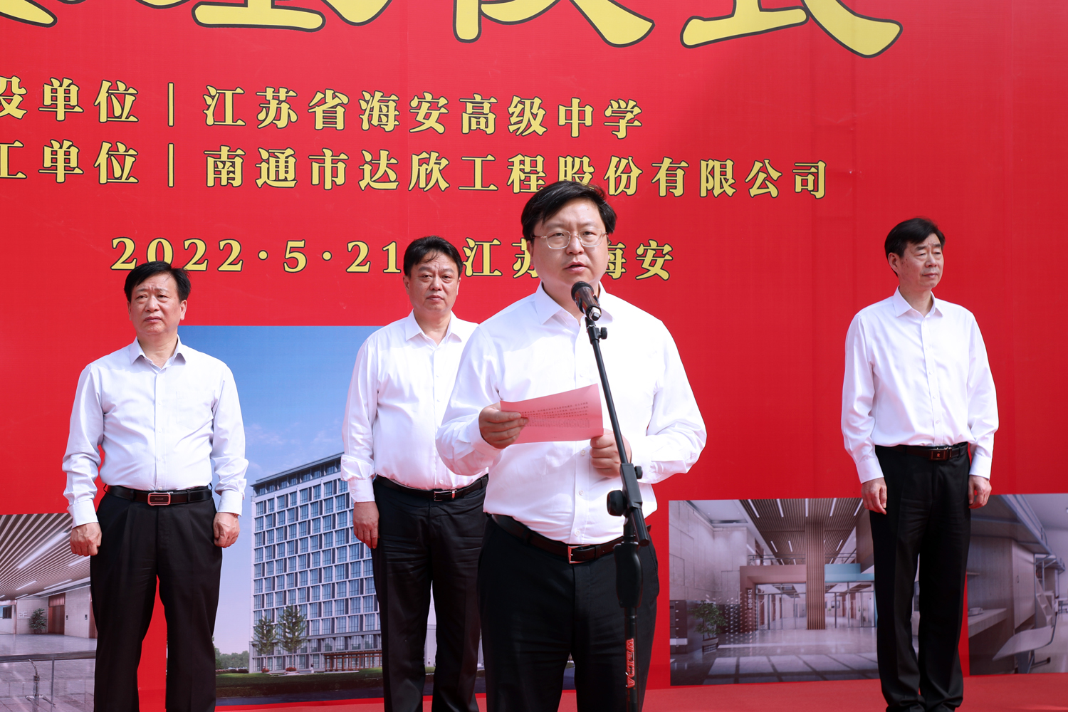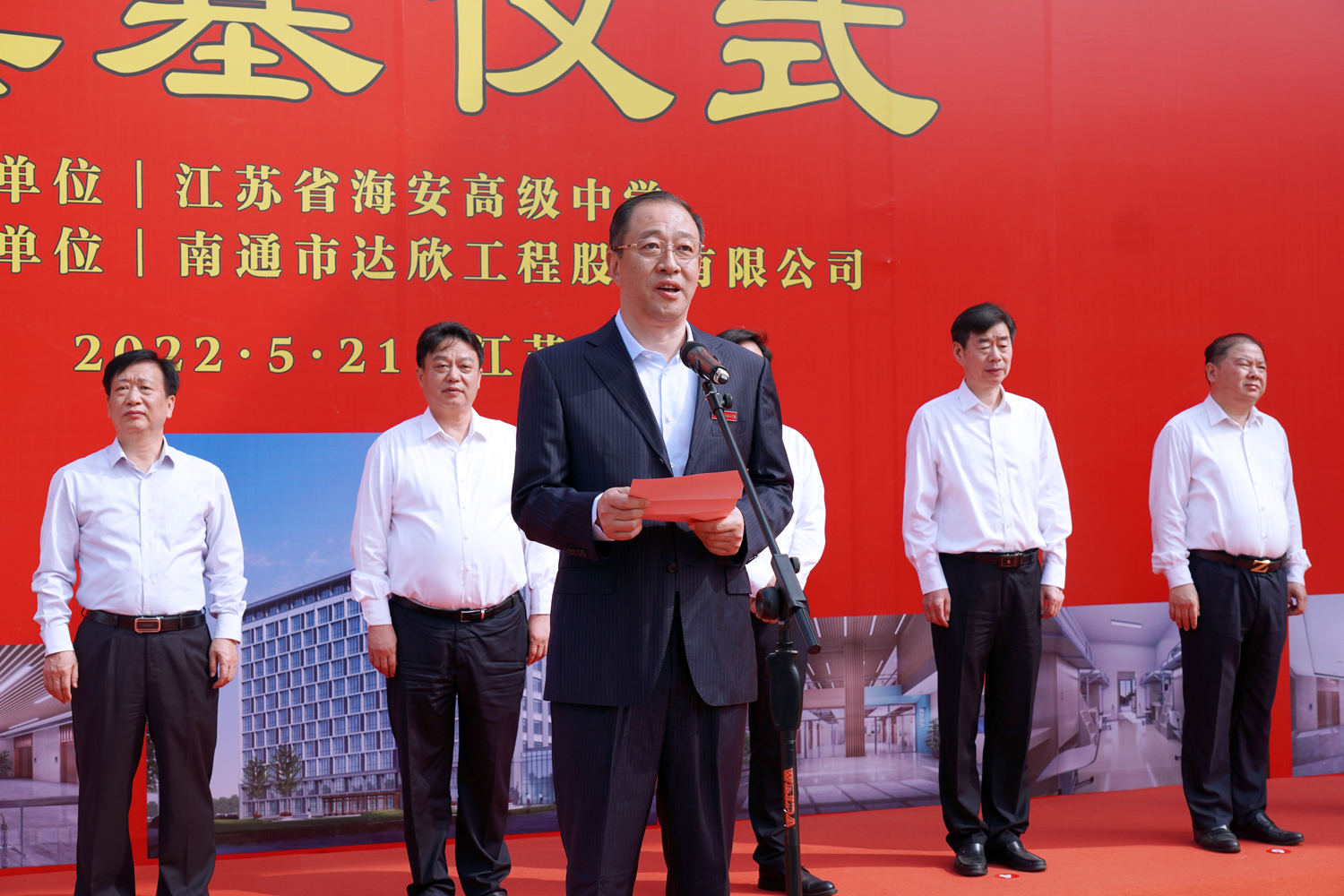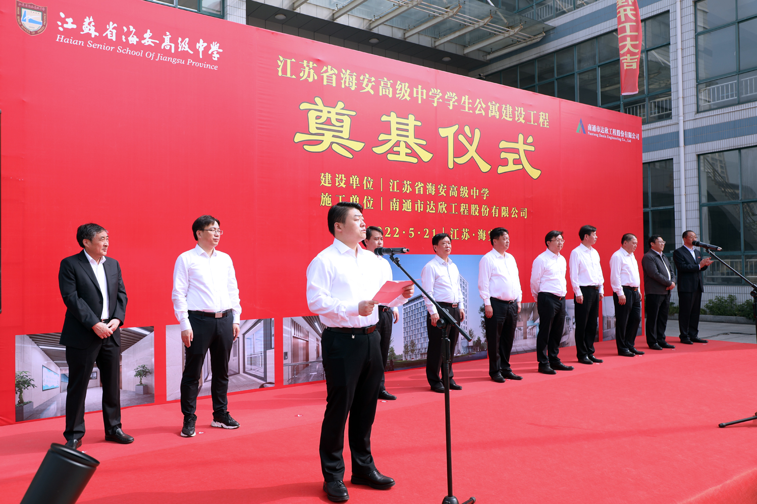 施工单位代表,南通市达欣工程股份有限公司董事长马和军代表工程总承包单位发言,他表示,能承建海安中学这样的国家级示范高中和海安市的重点教育工程,是市委、市政府和社会各界对达欣的高度肯定,公司将以“诚实守信,服务顾客”的经营理念和精益求精、锲而不舍的工匠精神,高起点开局、高水平建设、高要求管理,为海中的莘莘学子创造优良、舒适的住宿环境,为海安市教育事业做出应有的贡献。