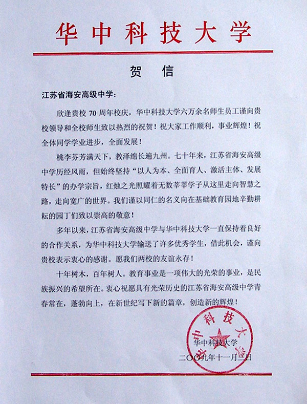 华中科技大学贺我校七十华诞