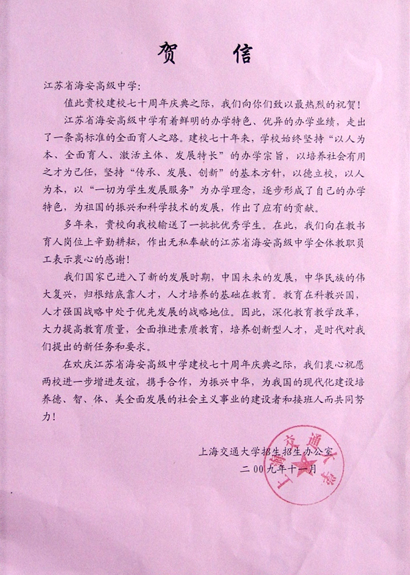 上海交通大学贺我校七十华诞