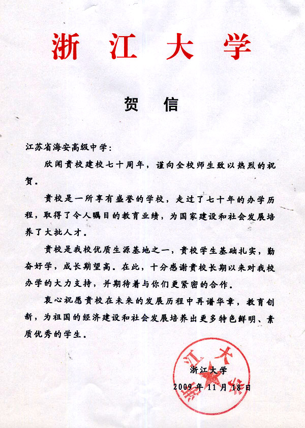 浙江大学贺我校七十华诞