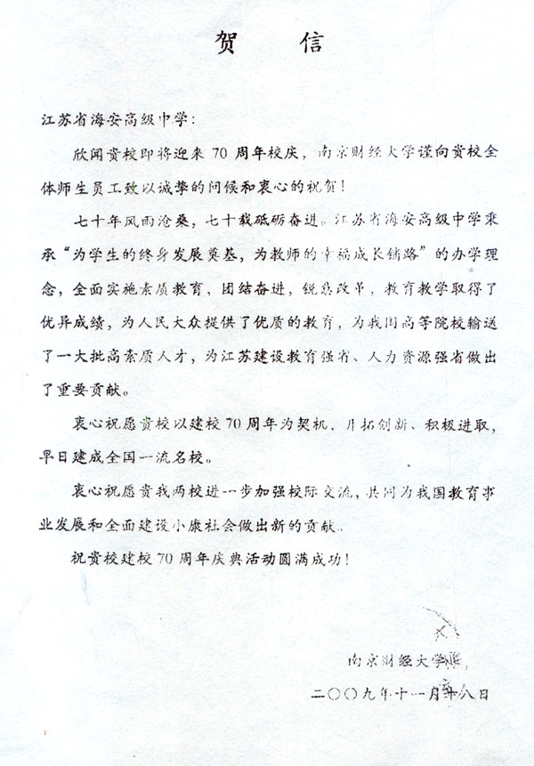 南京财经大学贺我校七十华诞